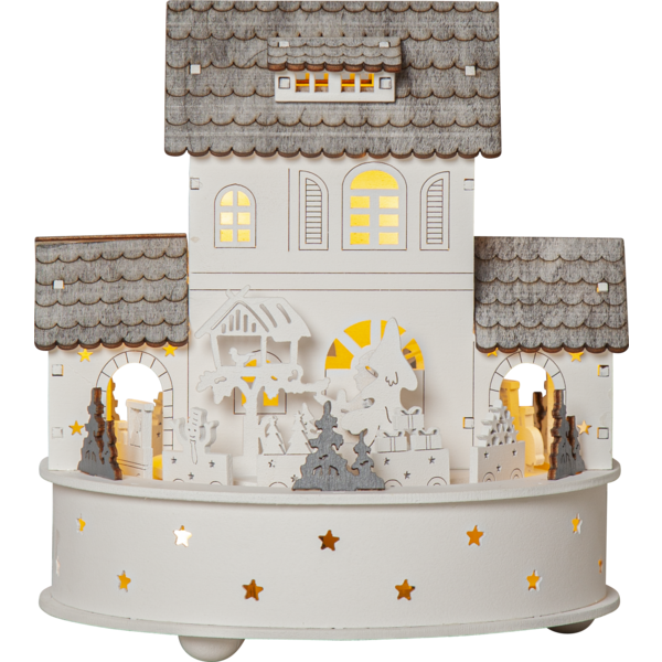 Be to, pasukus rankenėlę, namelis ima groti gražią melodiją, kuri dar labiau sustiprina šventinį įspūdį.