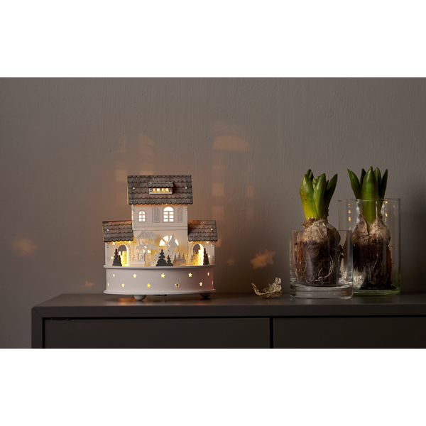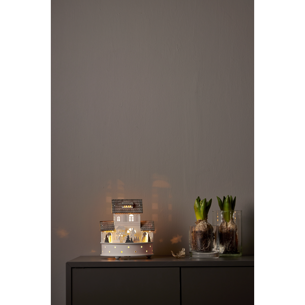 Įjungus gaminį, namas nuostabiai švyti, o pro mažus langelius sklindanti šviesa sukuria magišką atmosferą, kuri primena šiltą ir ramų žiemos vakarą.