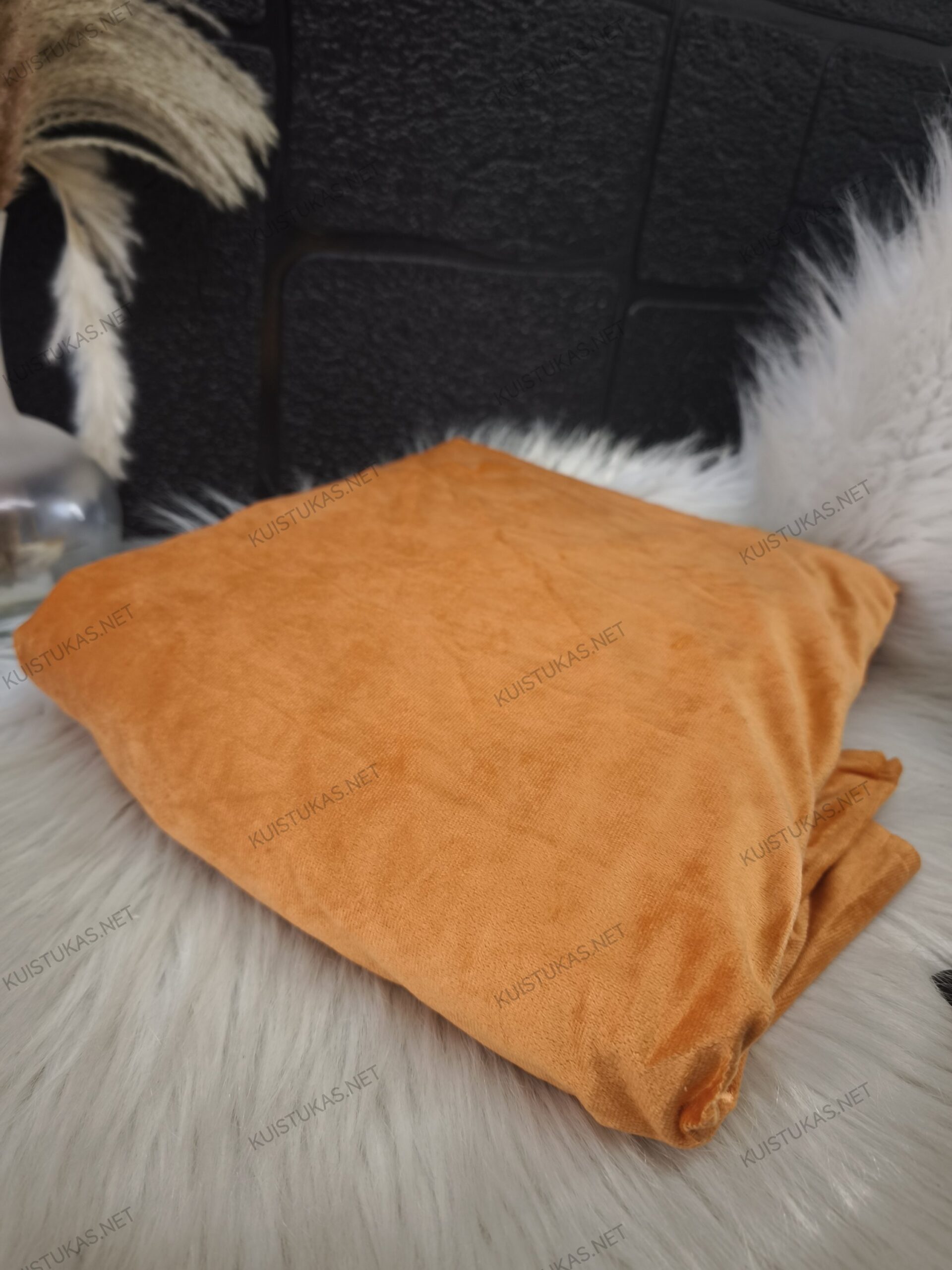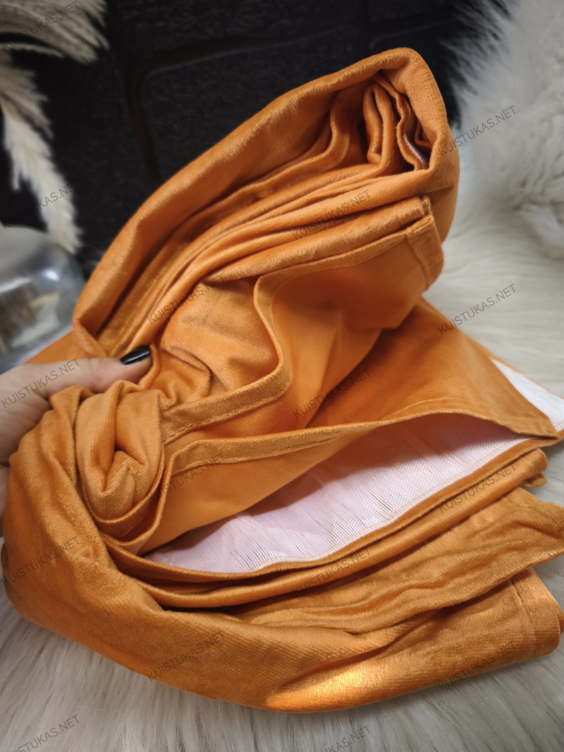 Oranžinis atspalvis su veliūro tekstūra atrodo itin prabangiai – audinys subtiliai žaidžia šviesa, todėl spalva gali kisti priklausomai nuo apšvietimo: dieną atrodyti šviesesnė ir gyvesnė, o vakare – gilesnė, šiltesnė ir dar jaukesnė.