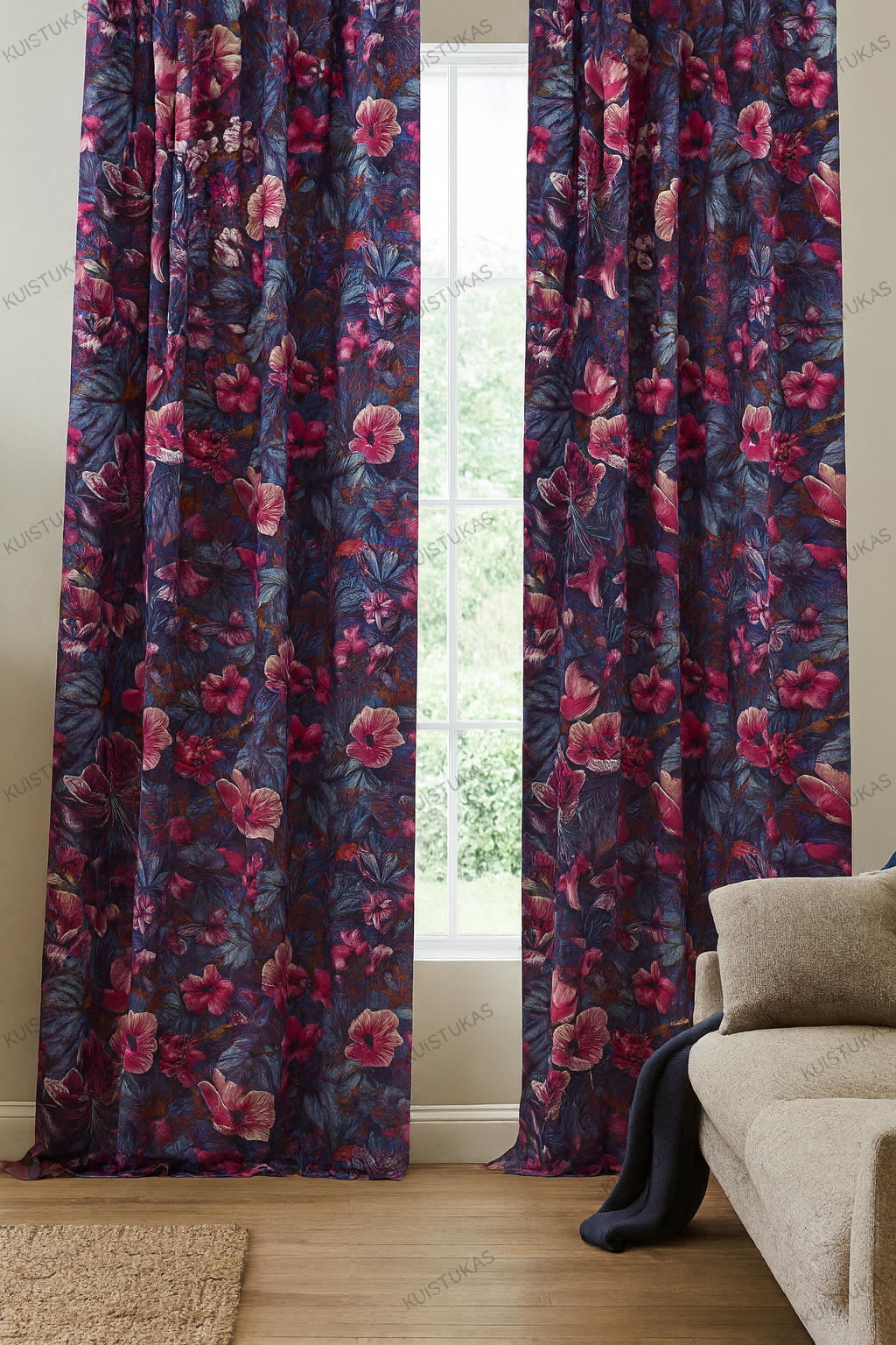 Šių užuolaidų spalvinė gama yra išties įspūdinga – gili mėlyna bazė puikiai dera su ryškiais rožiniais, raudonais bei purpuriniais gėlių raštais.