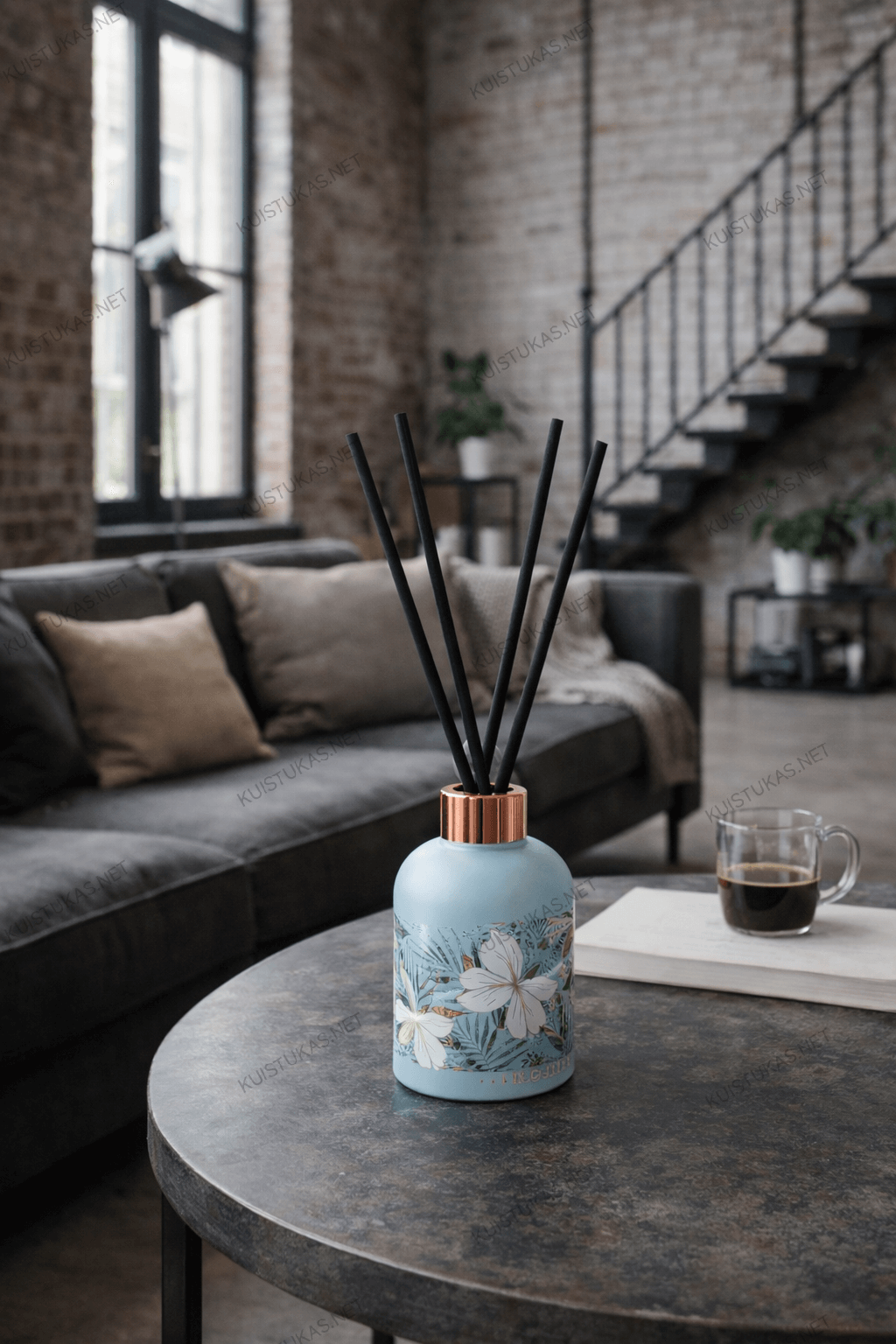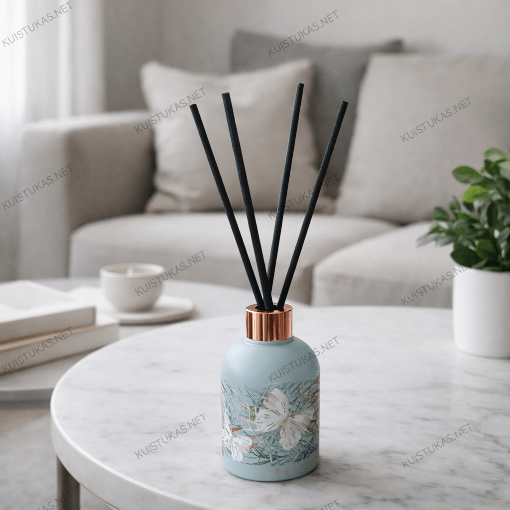 Stilingas buteliukas su juodais difuzoriaus pagaliukais puikiai dera bet kokiame interjere – nuo modernaus iki klasikinio.