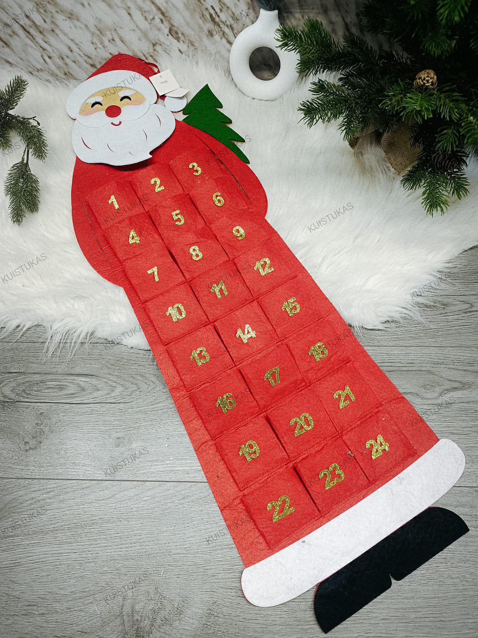 Kalėdų senelio formos kalendorius (ilgis 100 cm) – ryškiai raudonas, dekoruotas baltomis detalėmis, kurios primena tikrąjį Kalėdų senelį.