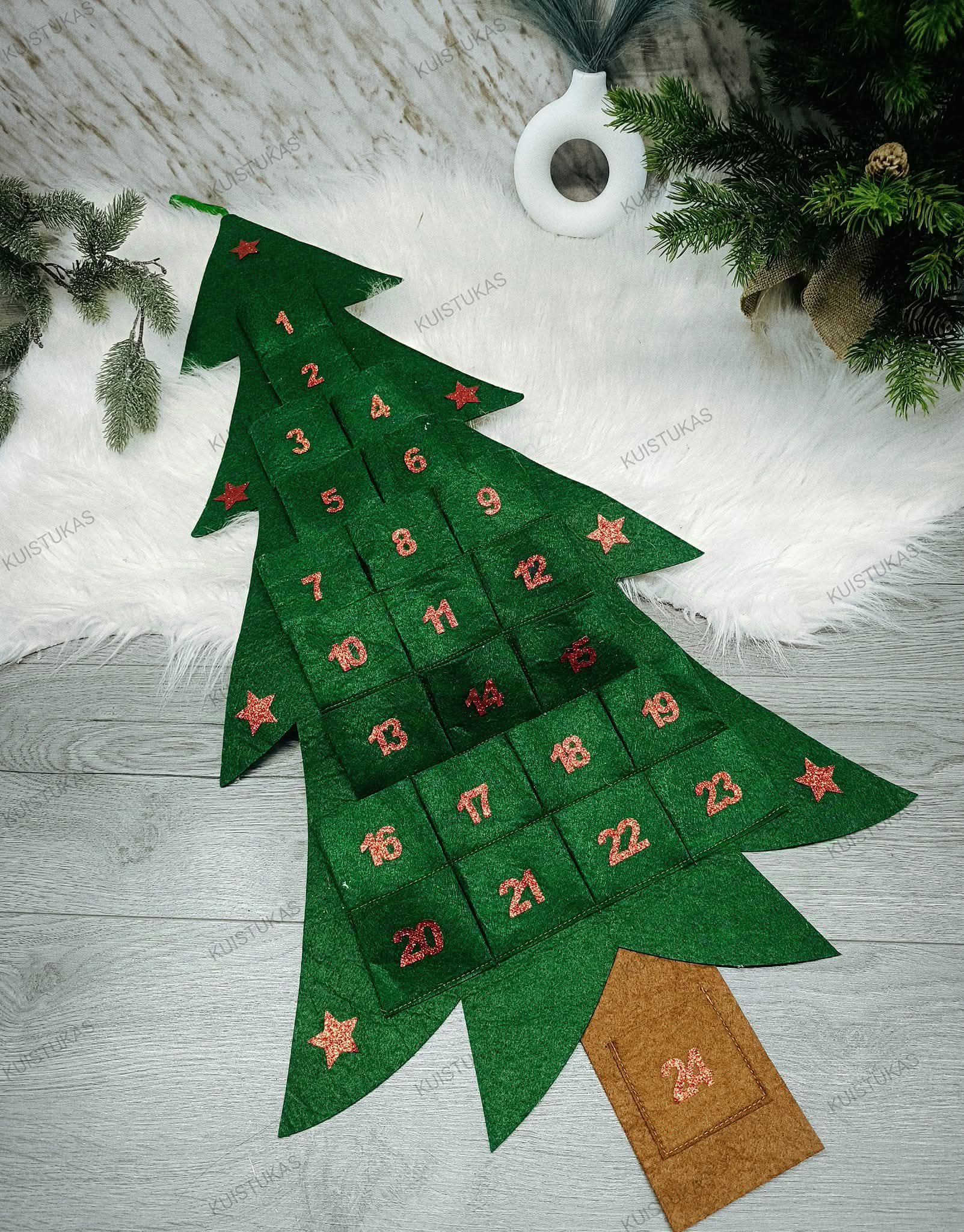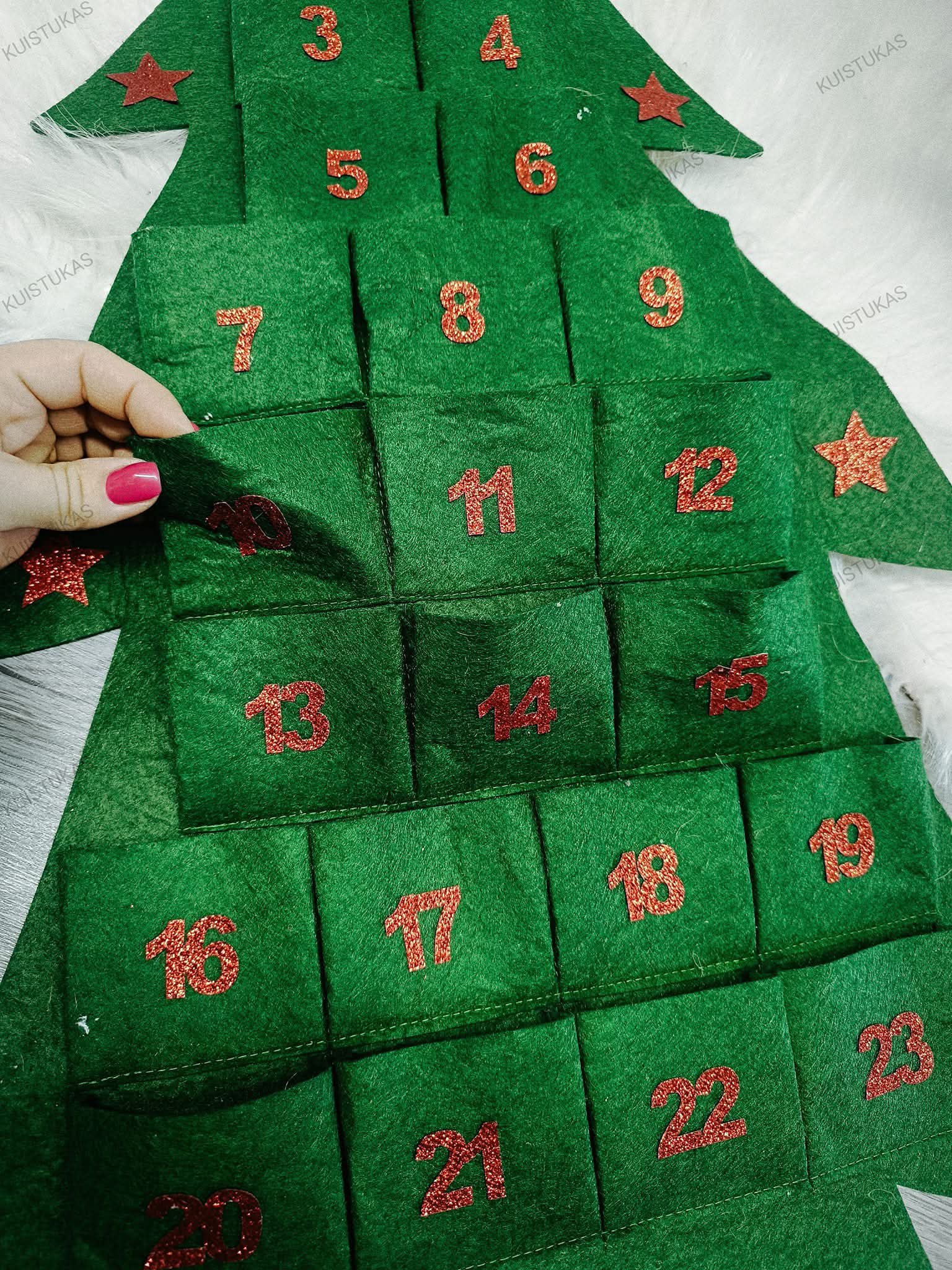Eglutės formos advento kalendorius (ilgis 96 cm) yra žalias, primenantis tikrą šventinę eglę.