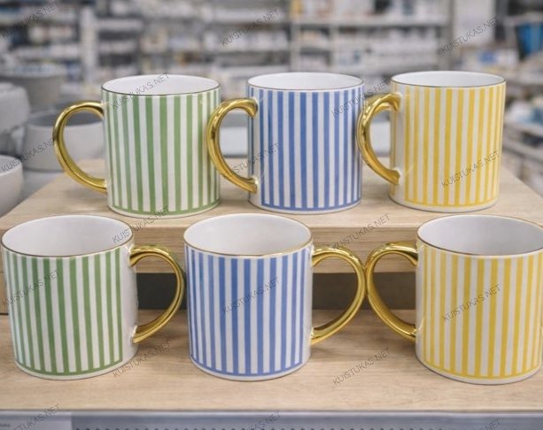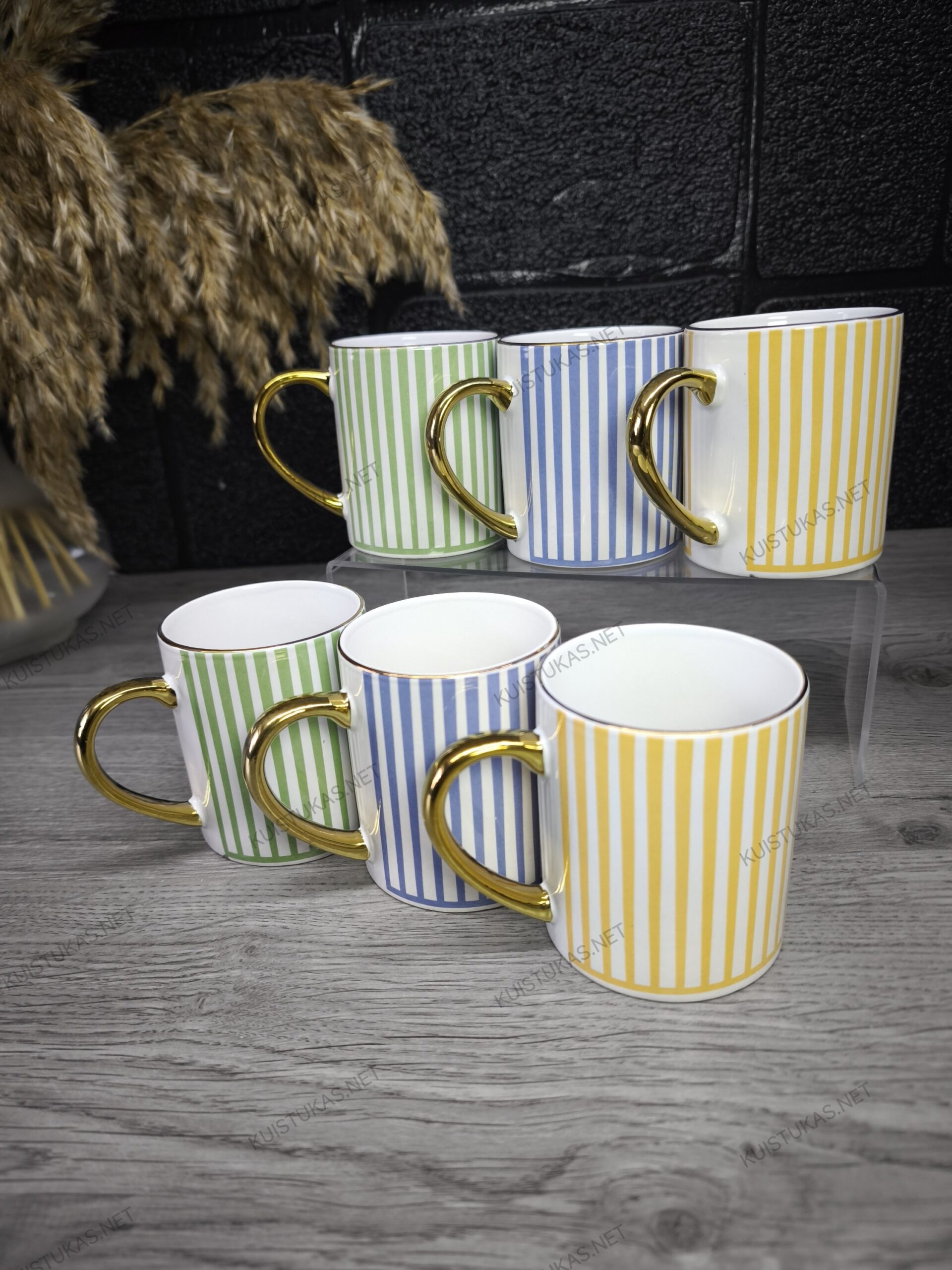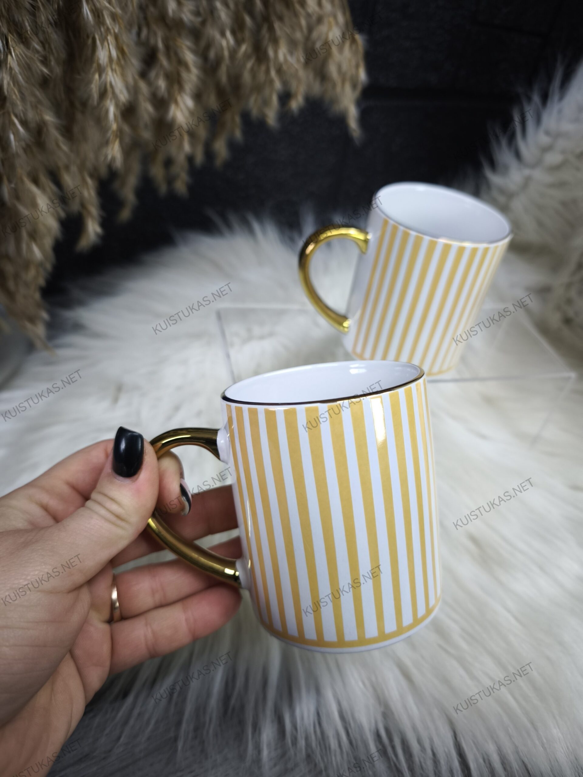 Šie keraminiai puodeliai išsiskiria moderniu dryžuotu raštu ir prabangia auksinės spalvos rankenėle, suteikiančia išskirtinumo bei rafinuoto žavesio.