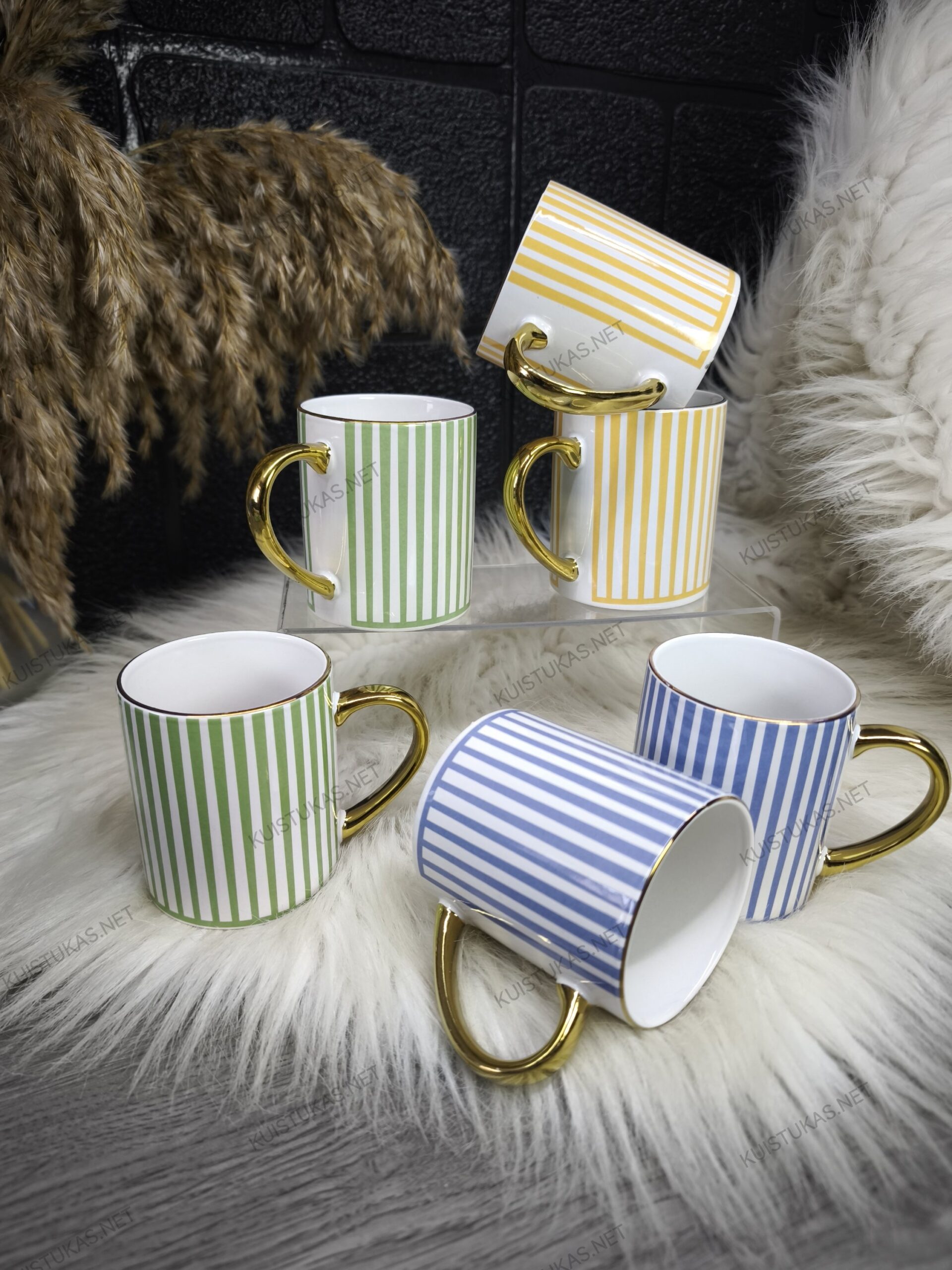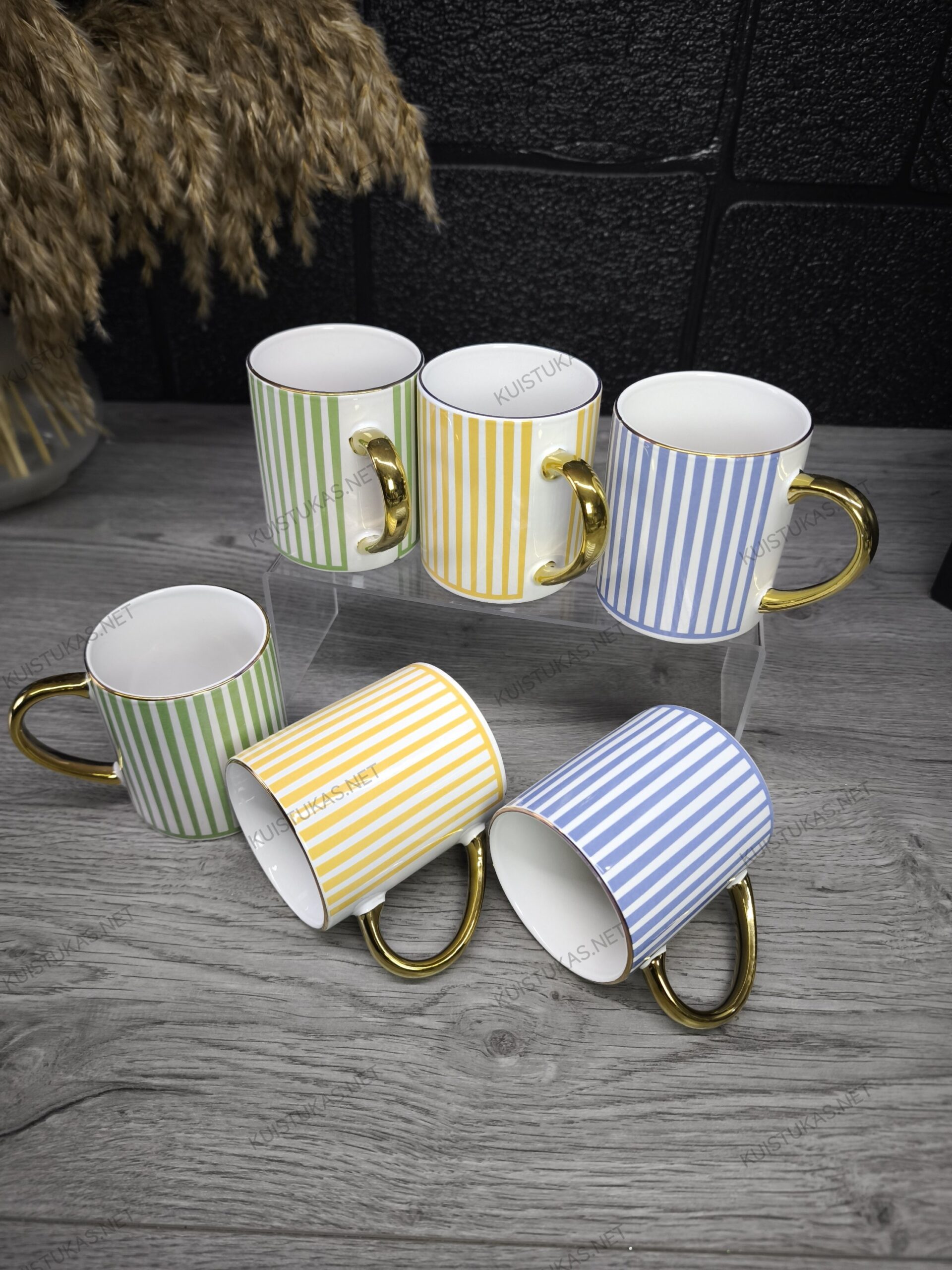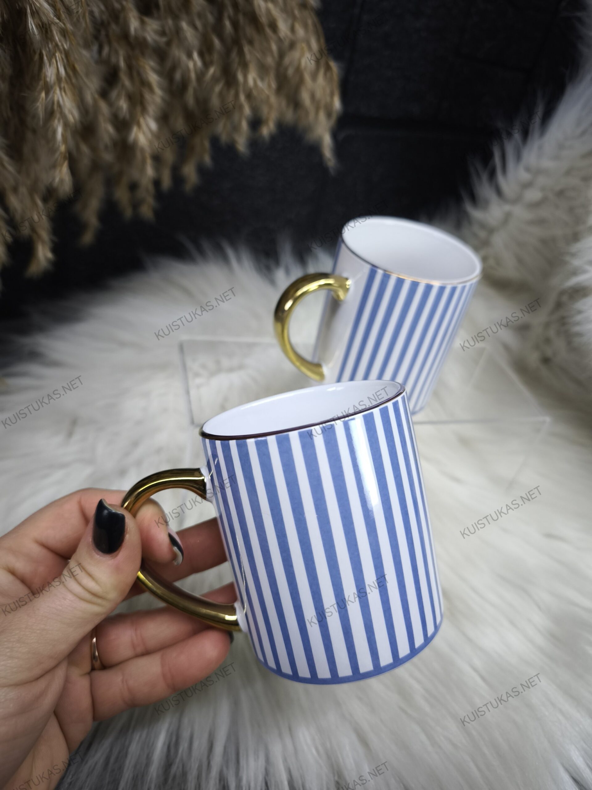 Šie keraminiai puodeliai išsiskiria moderniu dryžuotu raštu ir prabangia auksinės spalvos rankenėle, suteikiančia išskirtinumo bei rafinuoto žavesio.