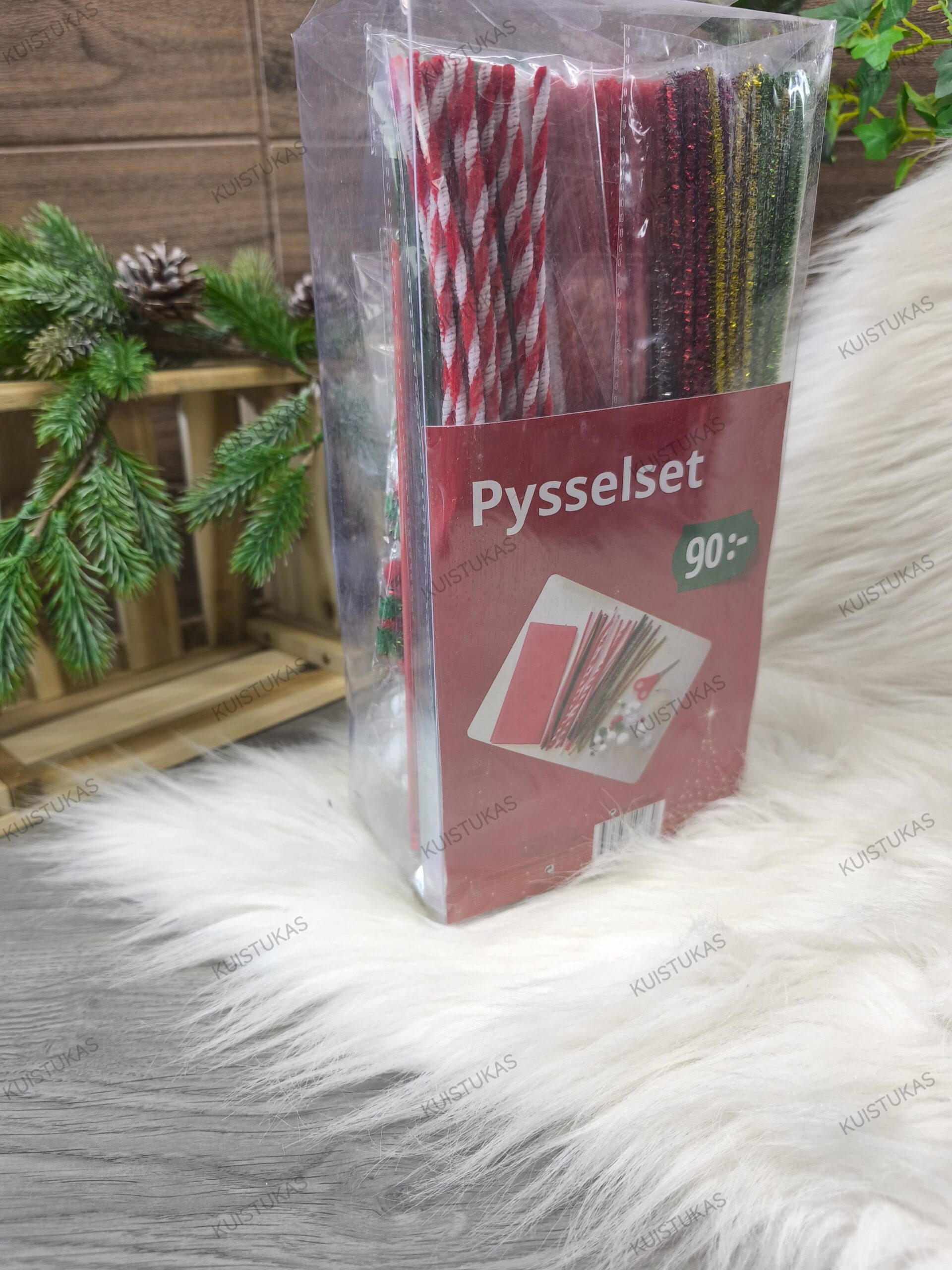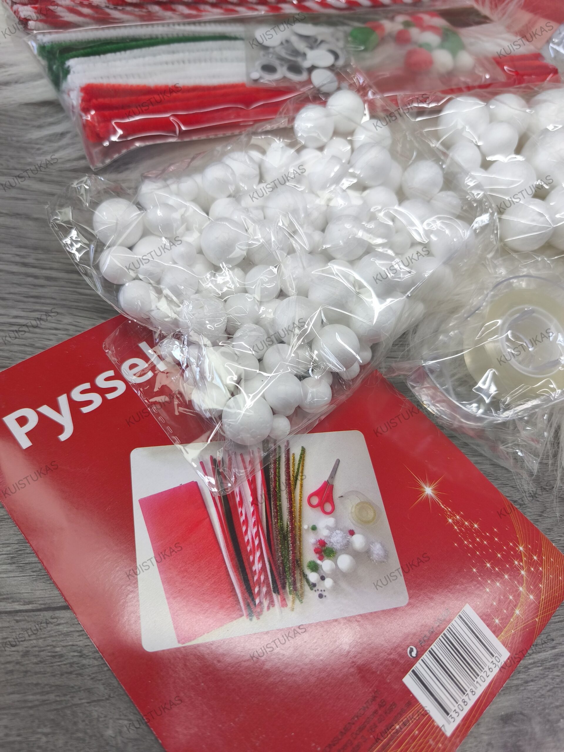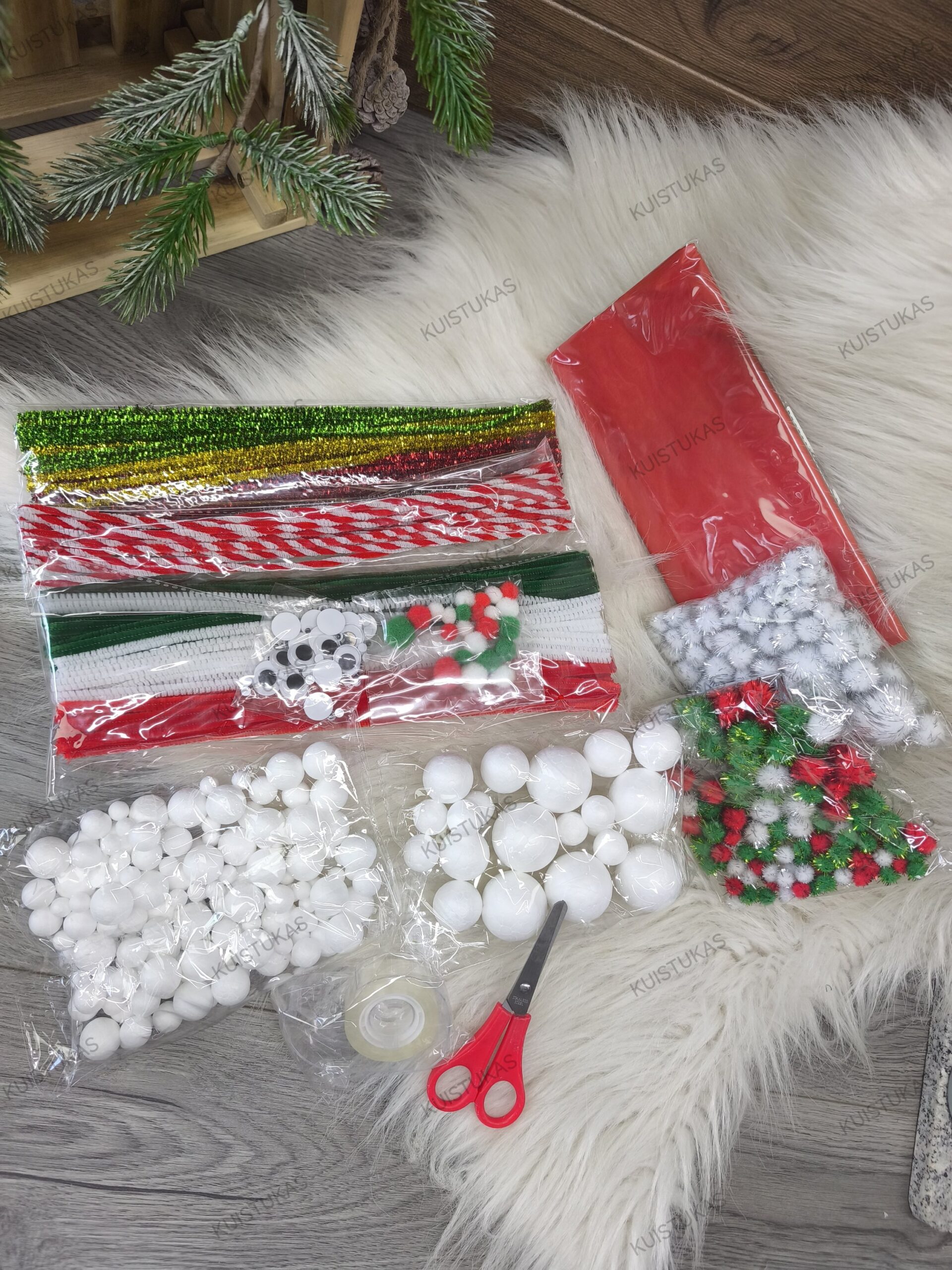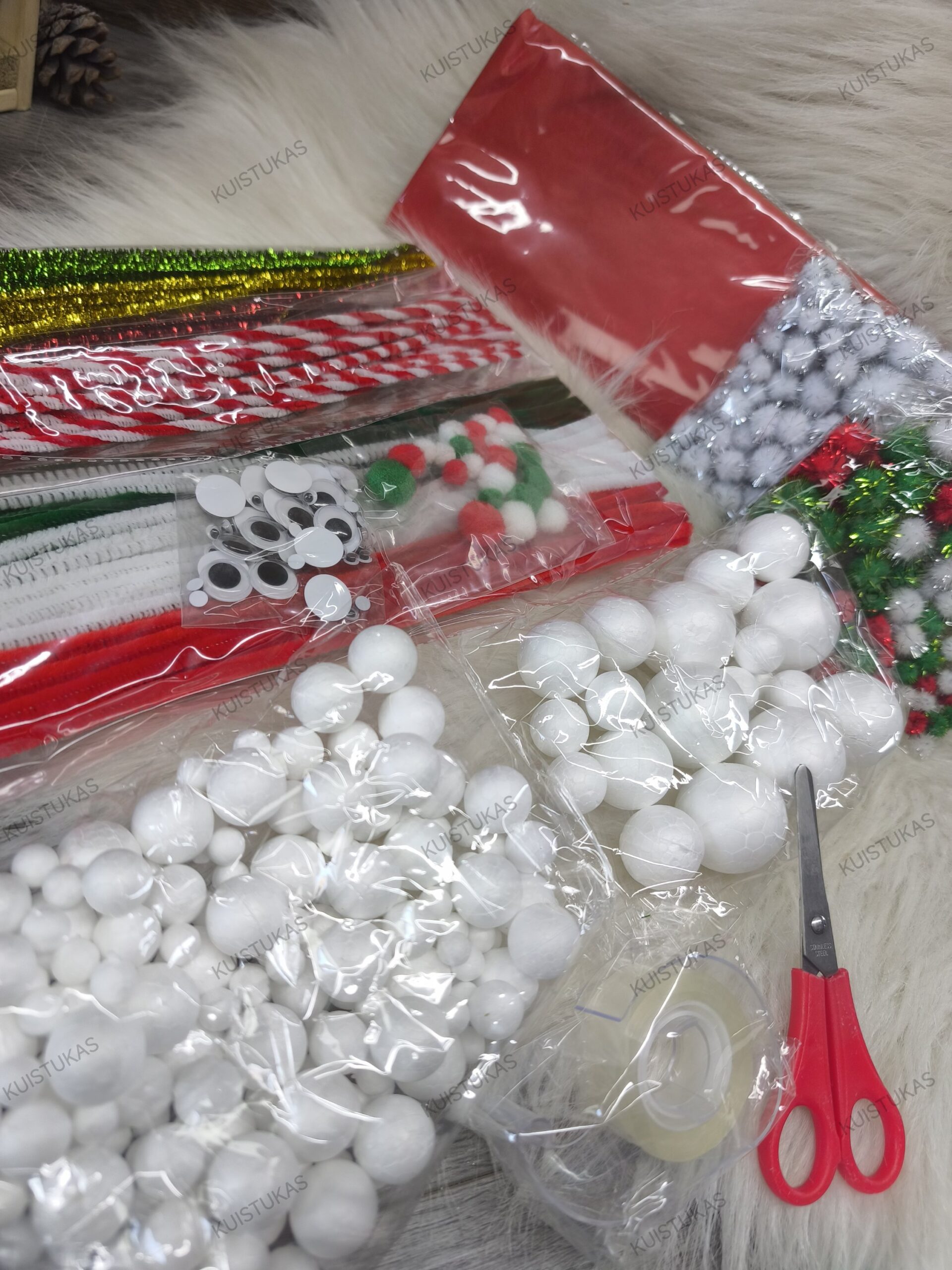 Rinkinyje rasite: spalvotus vamzdelius, pūkuotus kamuoliukus, akytes, polistirolo rutuliukus, dekoratyvinius elementus bei žirkles su lipnia juosta.