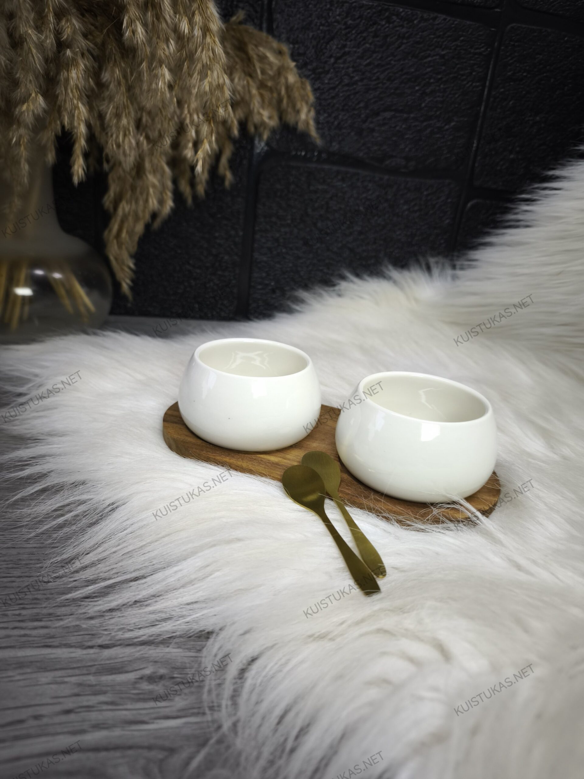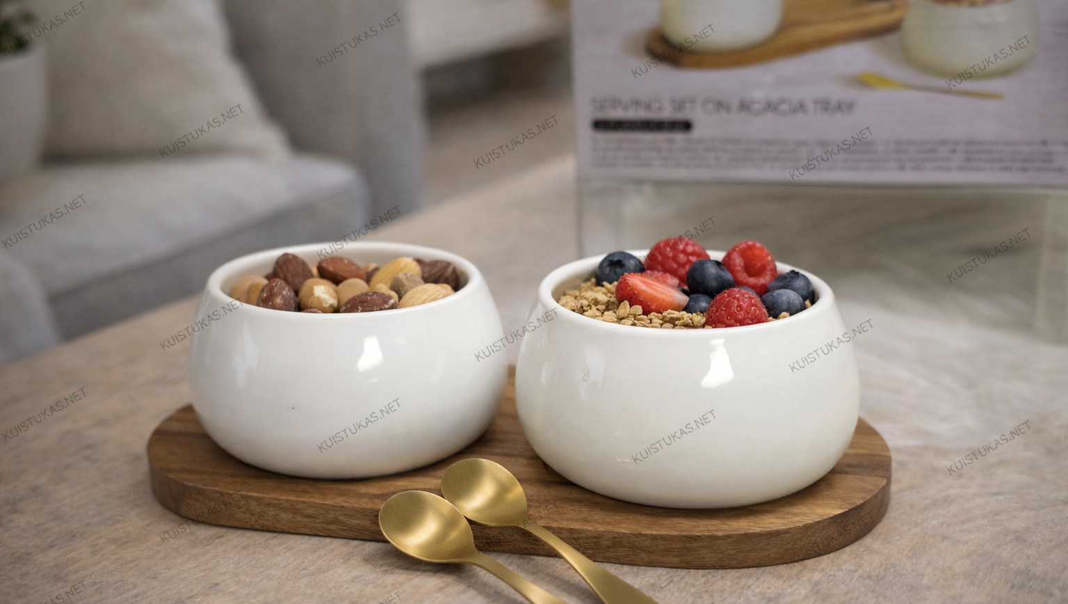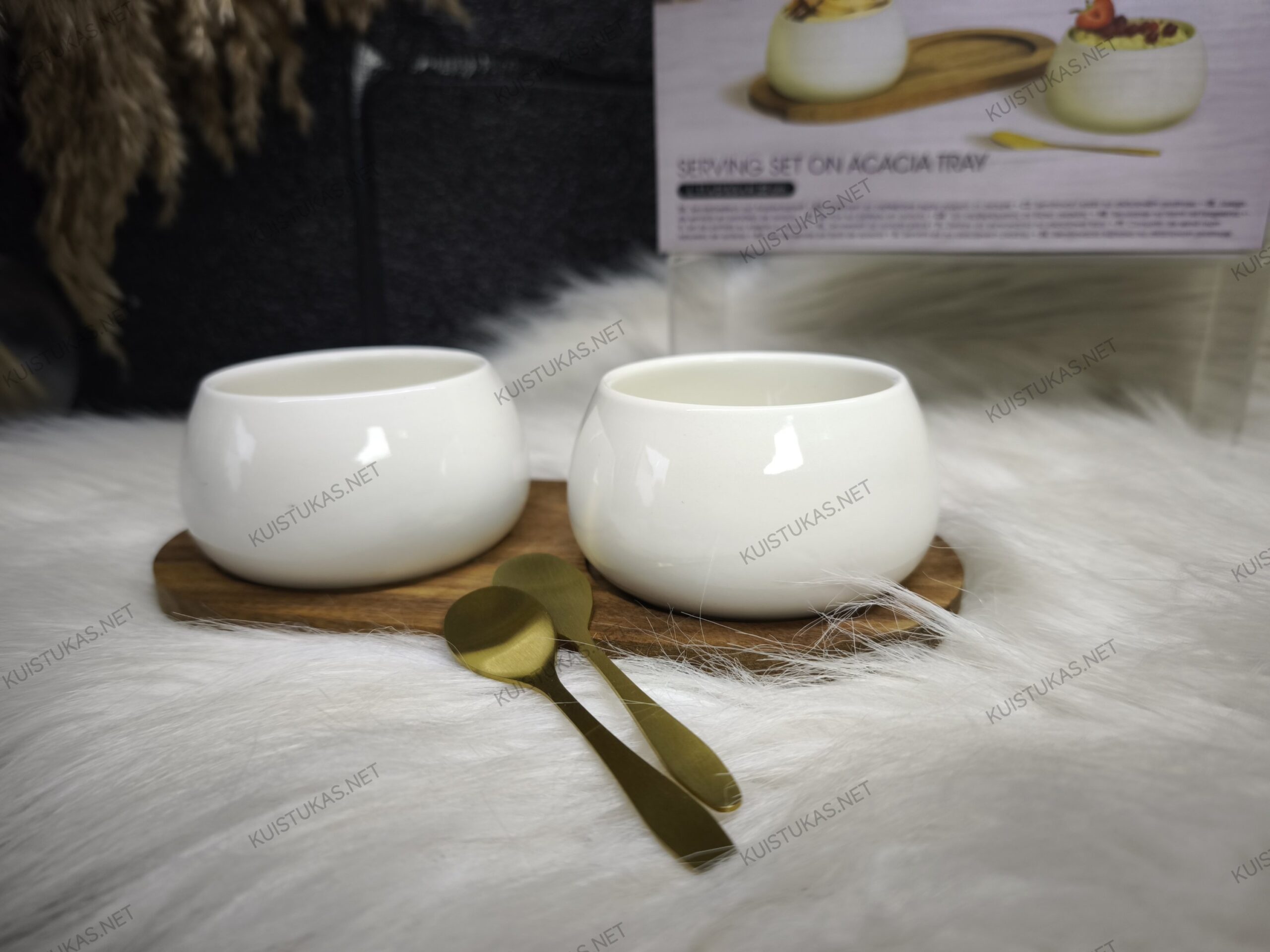 Rinkinį sudaro du keraminiai dubenėliai, du stilingi šaukšteliai bei akacijos medienos lentelė, ant kurios patogiai ir tvarkingai išdėstomi visi elementai.