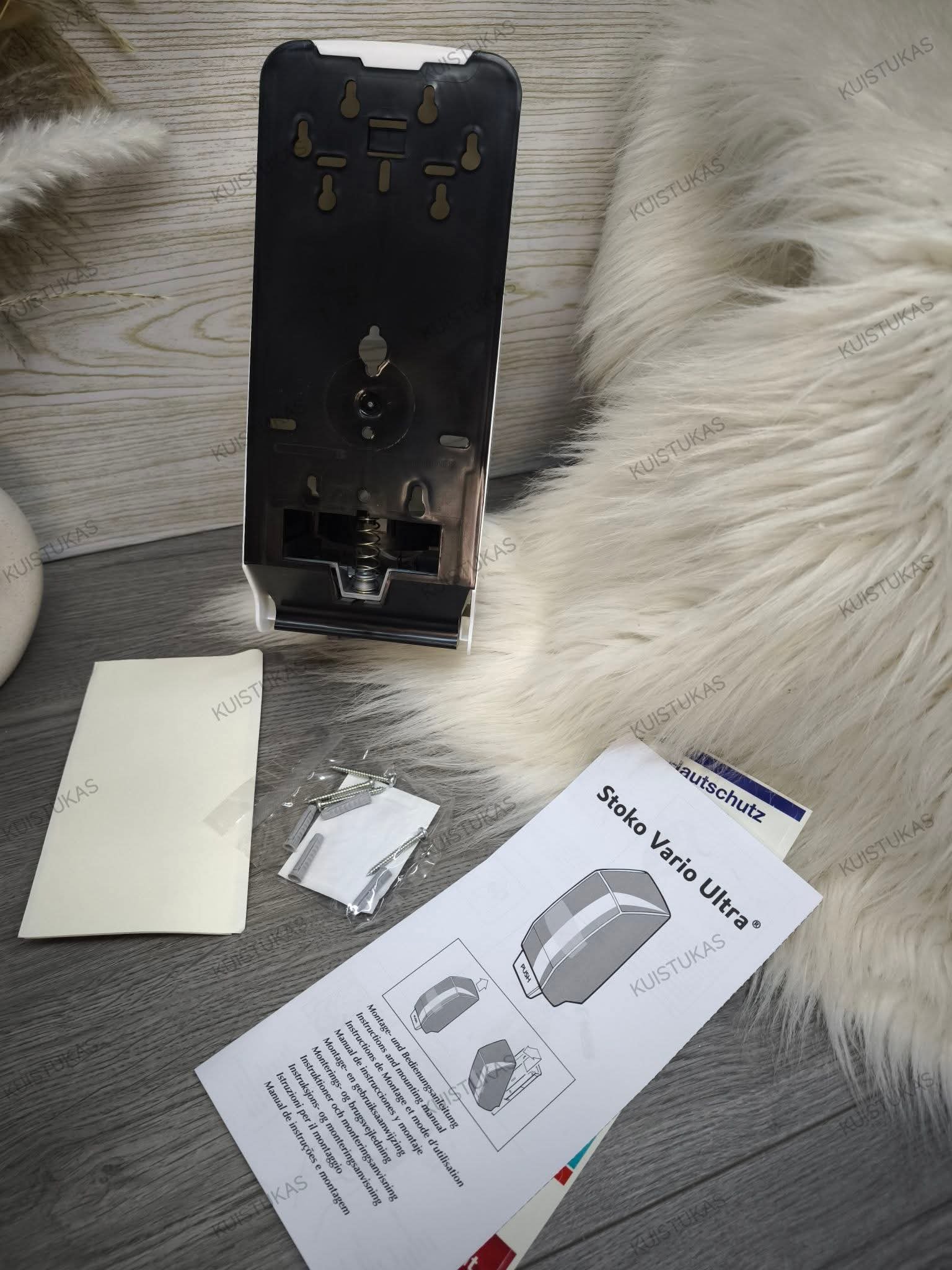 Dozatorius yra lengvai montuojamas ant sienos, o komplekte tvirtinamos tvirtinimo detalės, leidžiančios greitai ir paprastai pritvirtinti pasirinktą vietą.