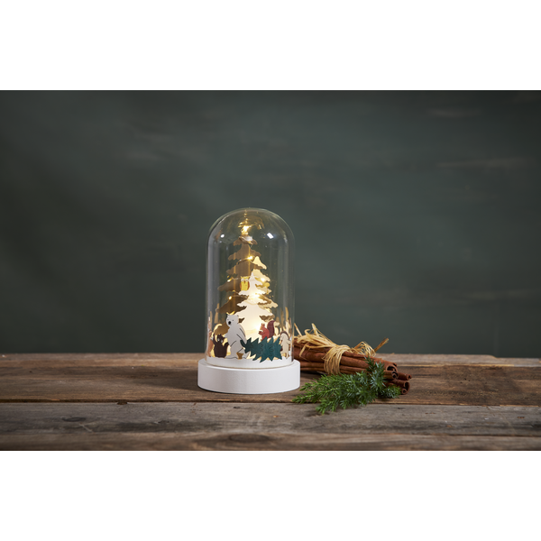 Po stikliniu kupolu slypi lazeriu pjaustytos medinės figūrėlės – žvėreliai ir miško motyvai, kurie sukuria pasakišką Kalėdų atmosferą.