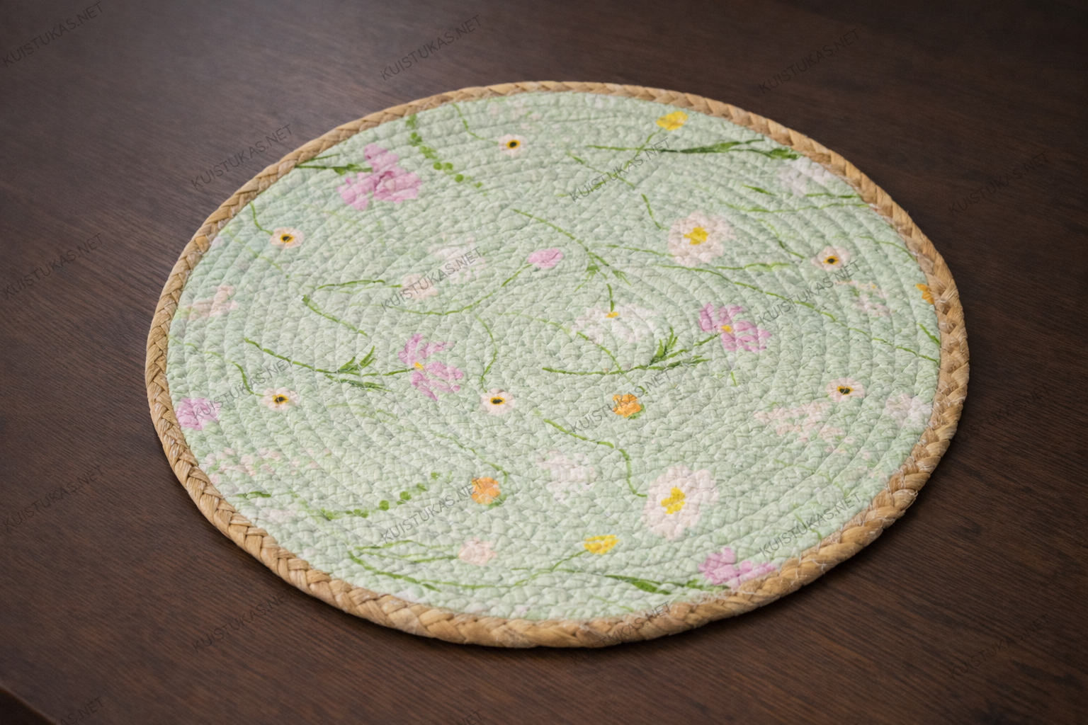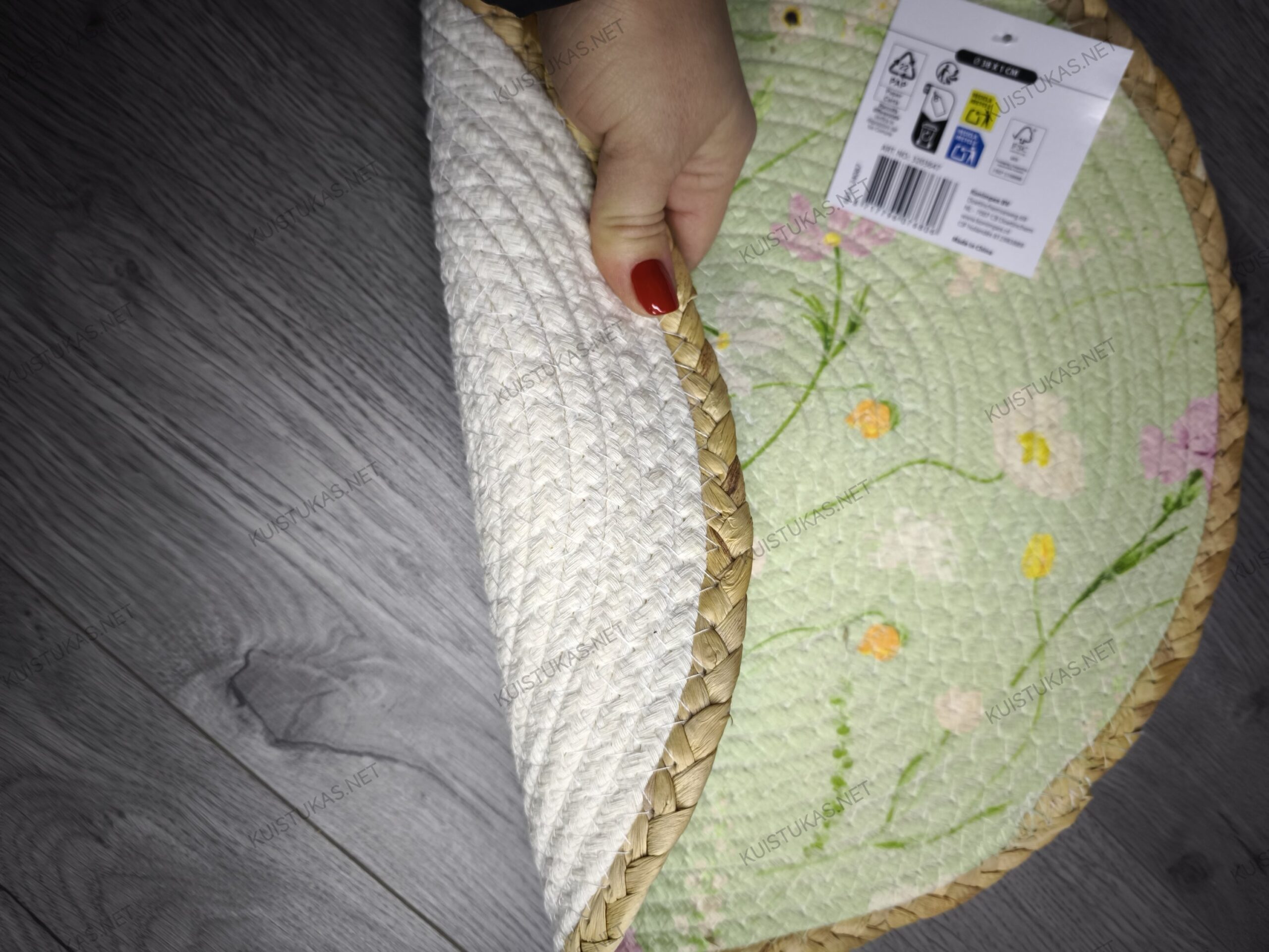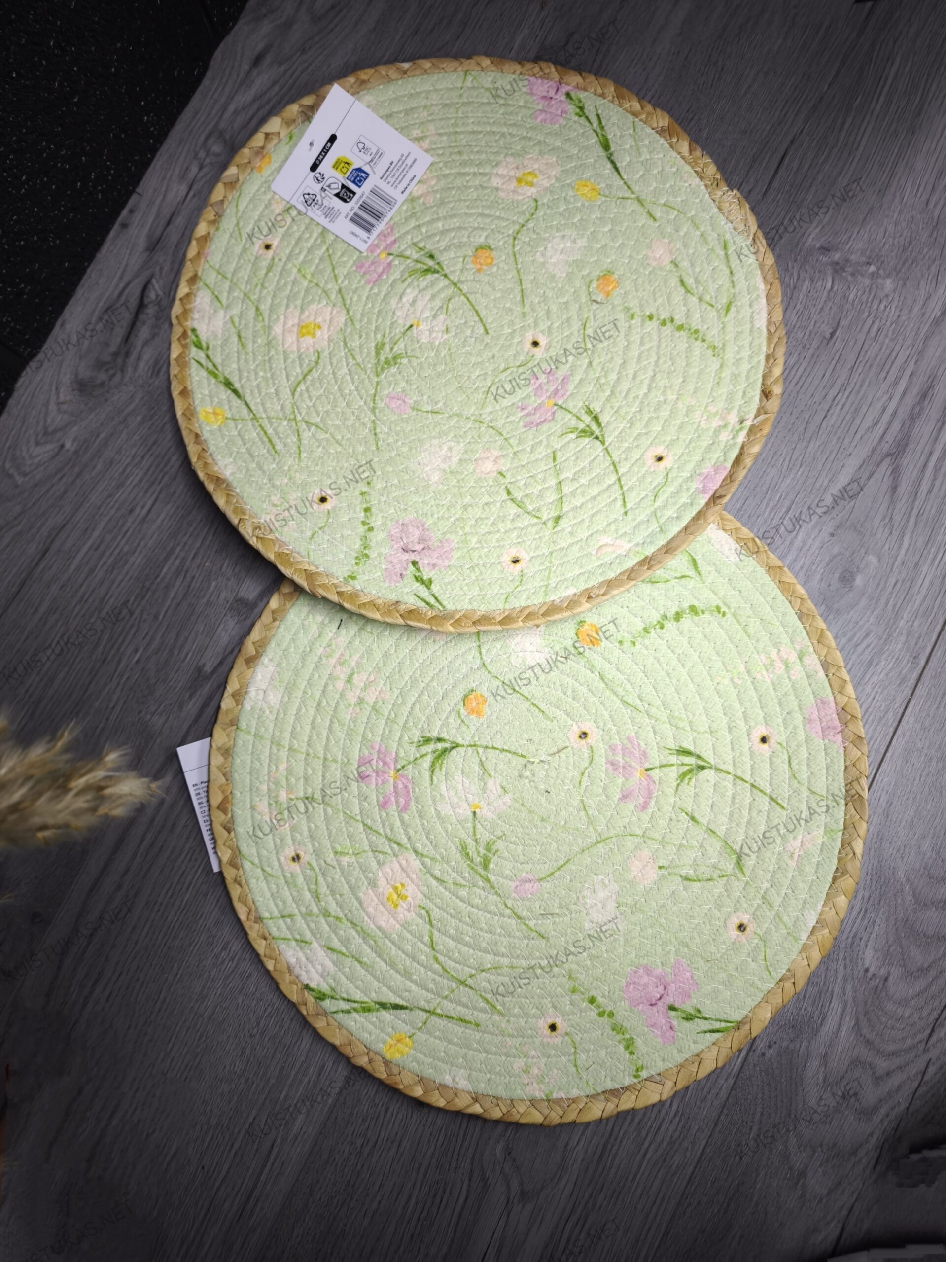 Padėkliukas yra dvipusis – viena pusė dekoruota žaismingu gėlių raštu, o kita pusė yra vienspalvė su apipintu kraštu, todėl vienu paprastu apvertimu galėsite keisti stalo nuotaiką pagal progą ar asmeninį stilių.