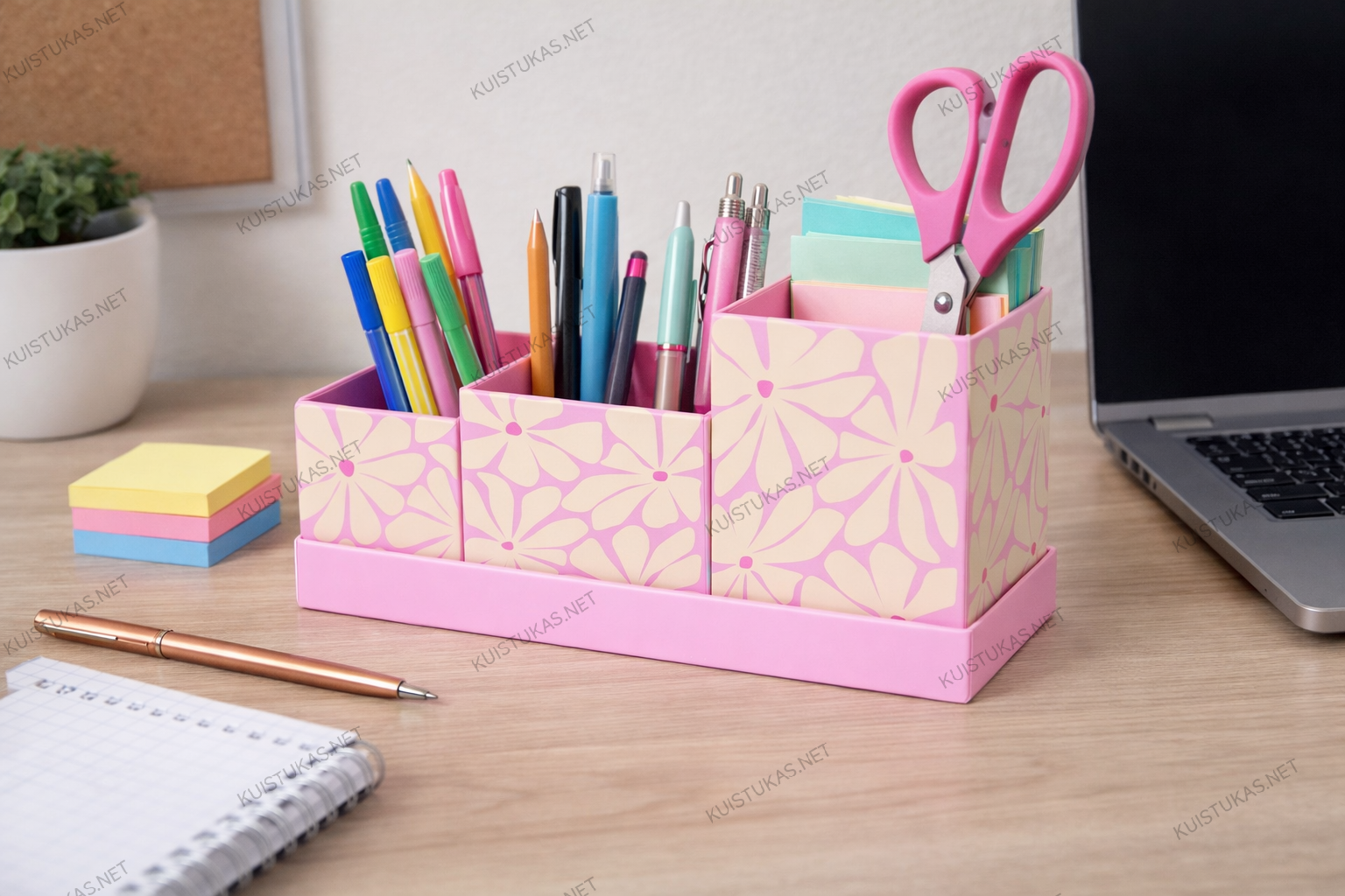 Šis rožinis stalo organizatorius su indeliais ne tik leidžia patogiai laikyti įvairius daiktus, bet ir tampa žaviu interjero akcentu, kuris suteikia erdvei šilumos, spalvų ir žaismingumo.