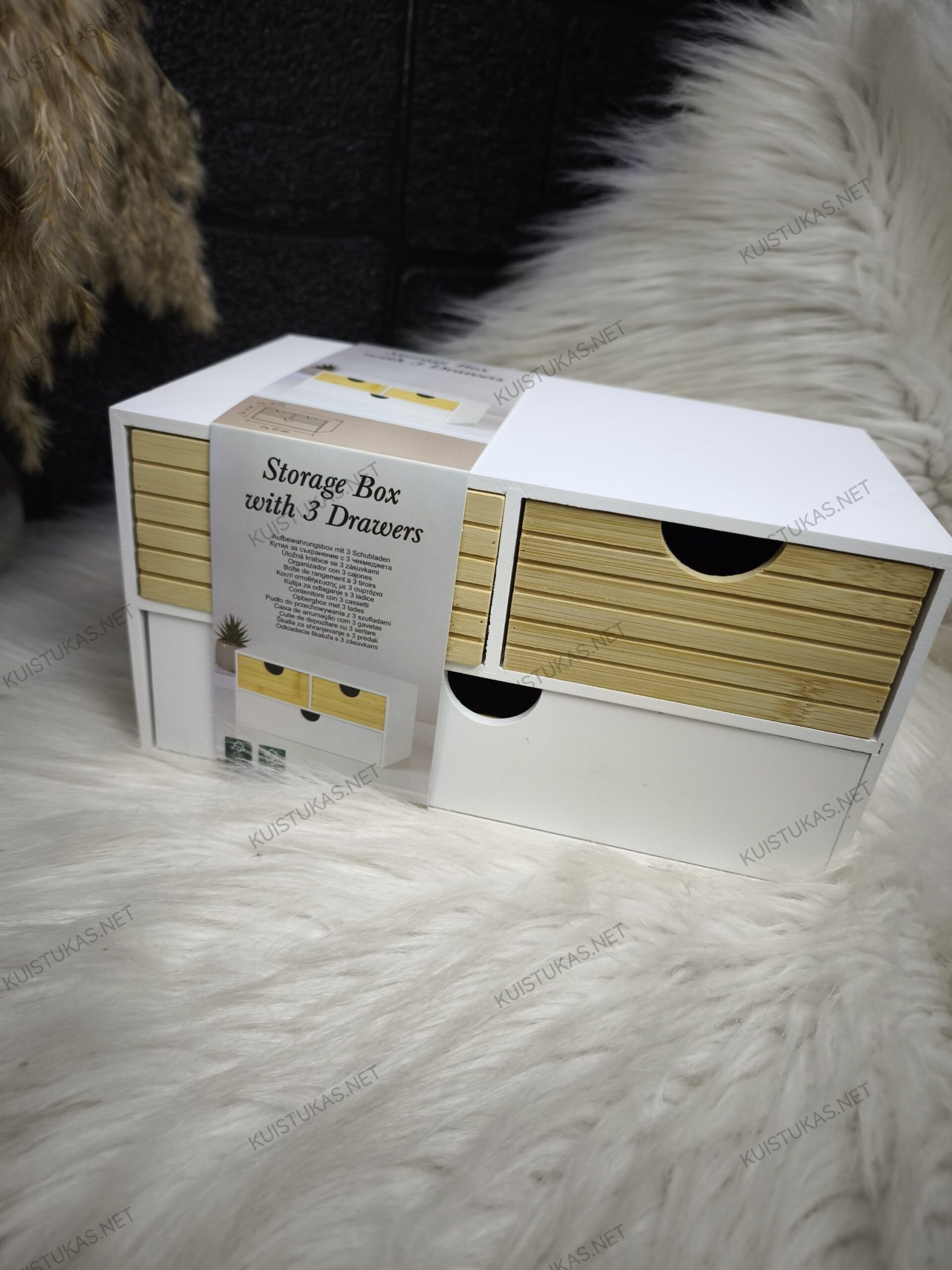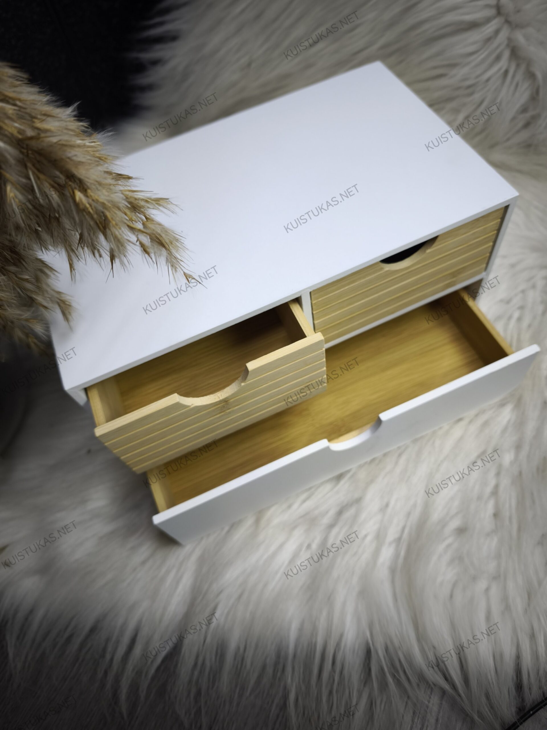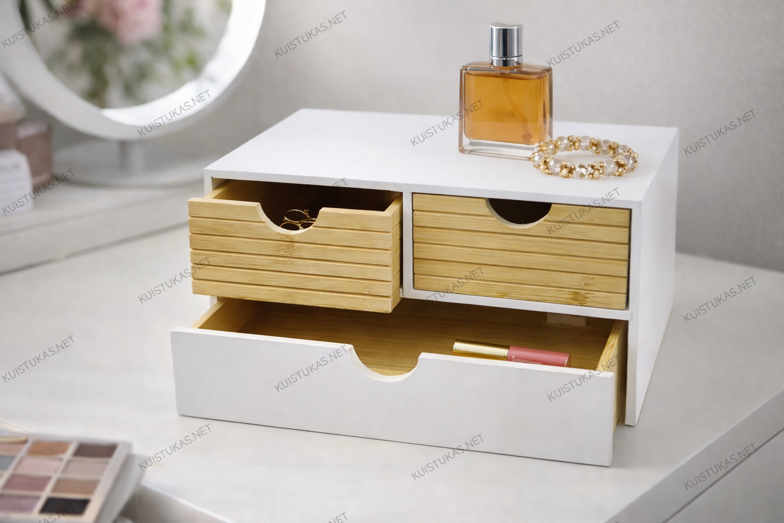 Trijų stalčių konstrukcija leidžia patogiai atskirti ir laikyti įvairius daiktus: kosmetiką, papuošalus, raštinės reikmenis, aksesuarus, raktus, laikrodžius, kabelius ar kitus kasdien naudojamus smulkius daiktus.