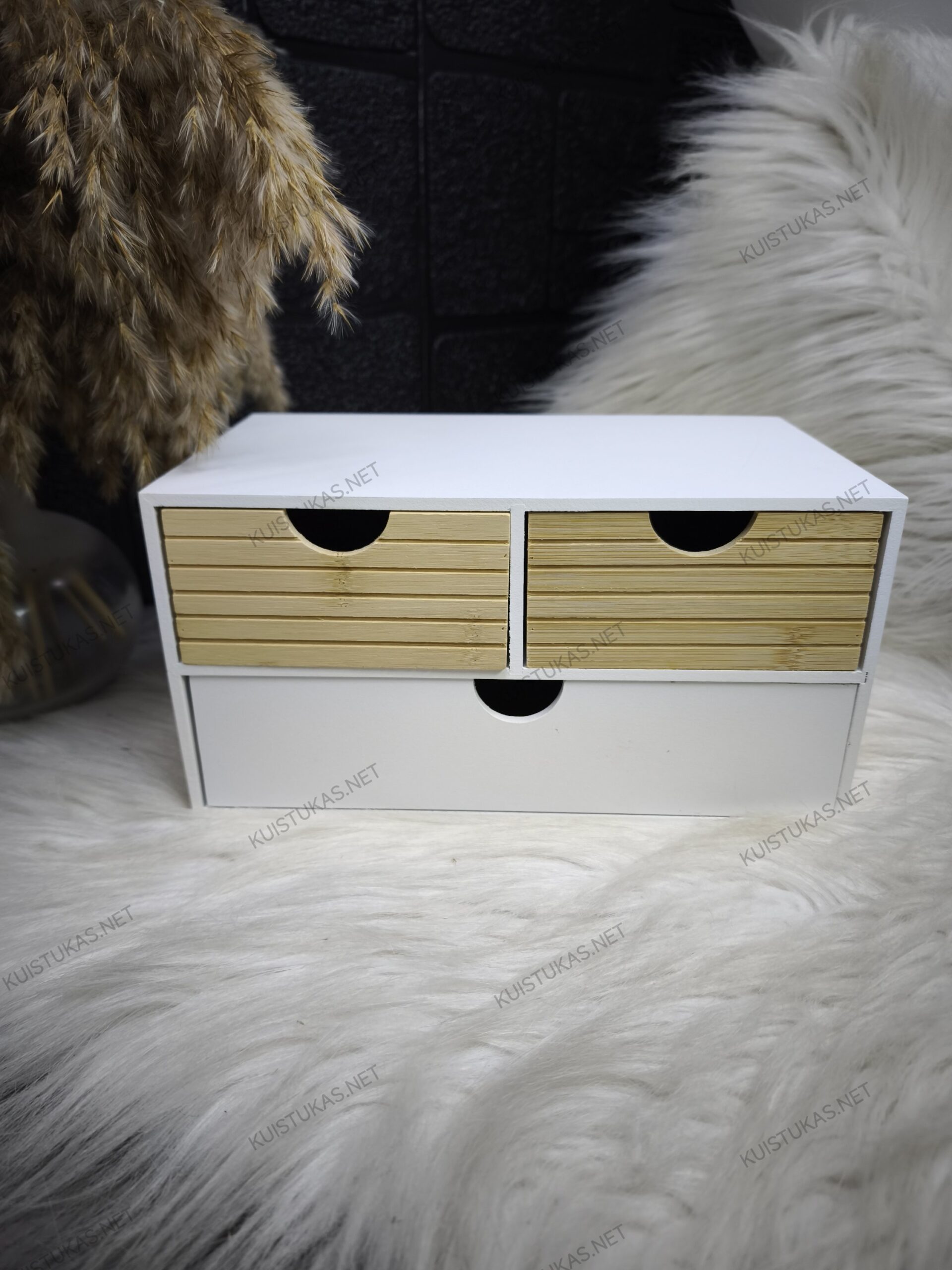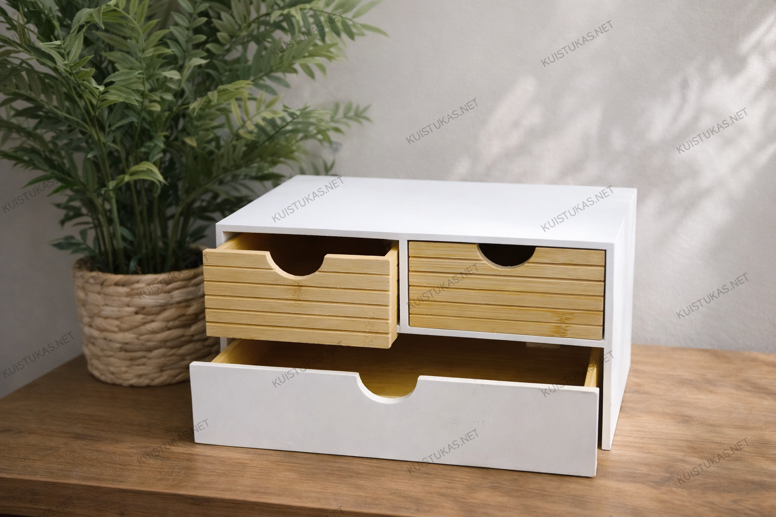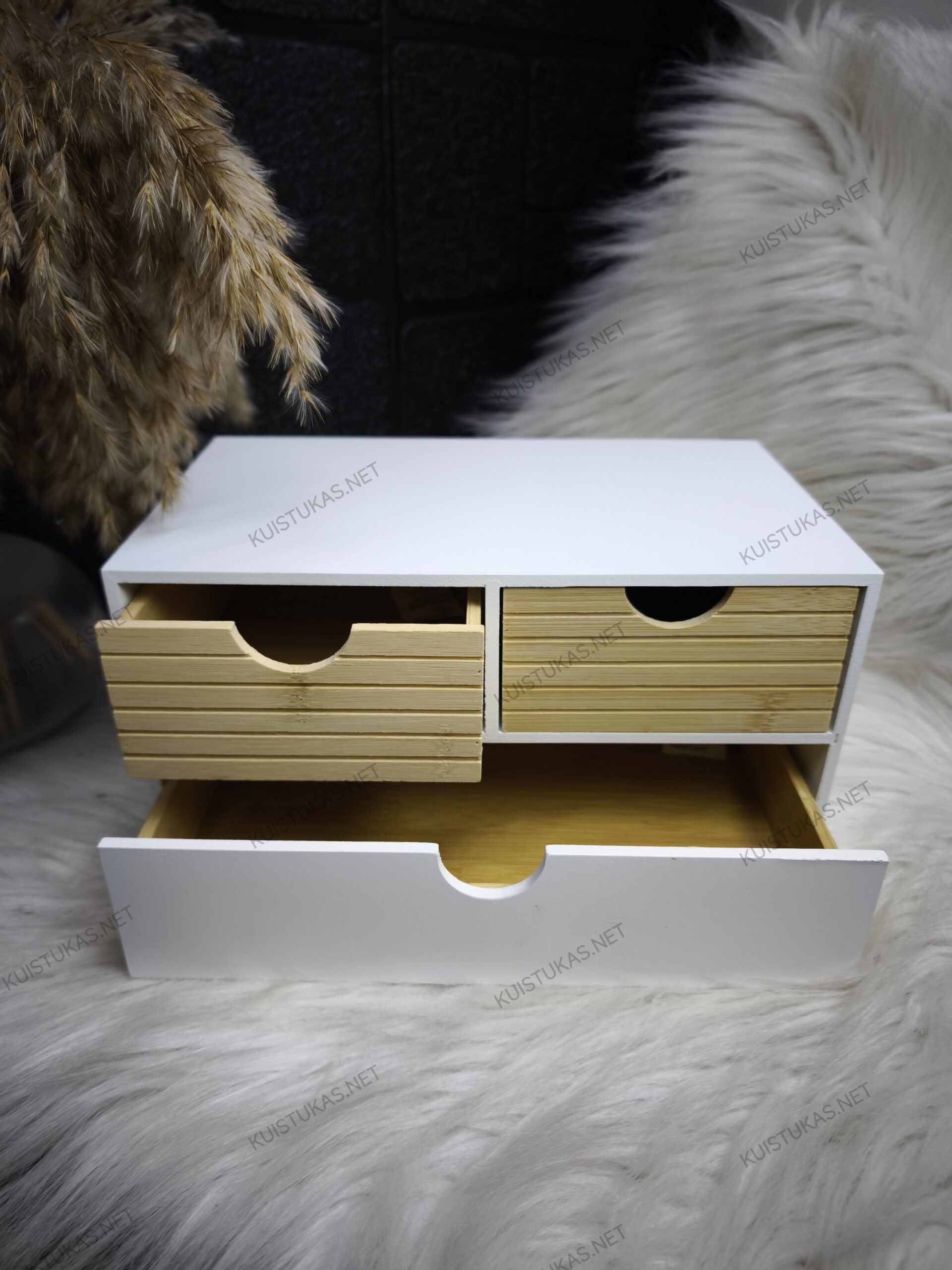 Minimalistinis dizainas, derinantis šviesią MDF spalvą su natūralaus bambuko detalėmis, suteikia organizatoriui šiuolaikišką ir jaukų charakterį.