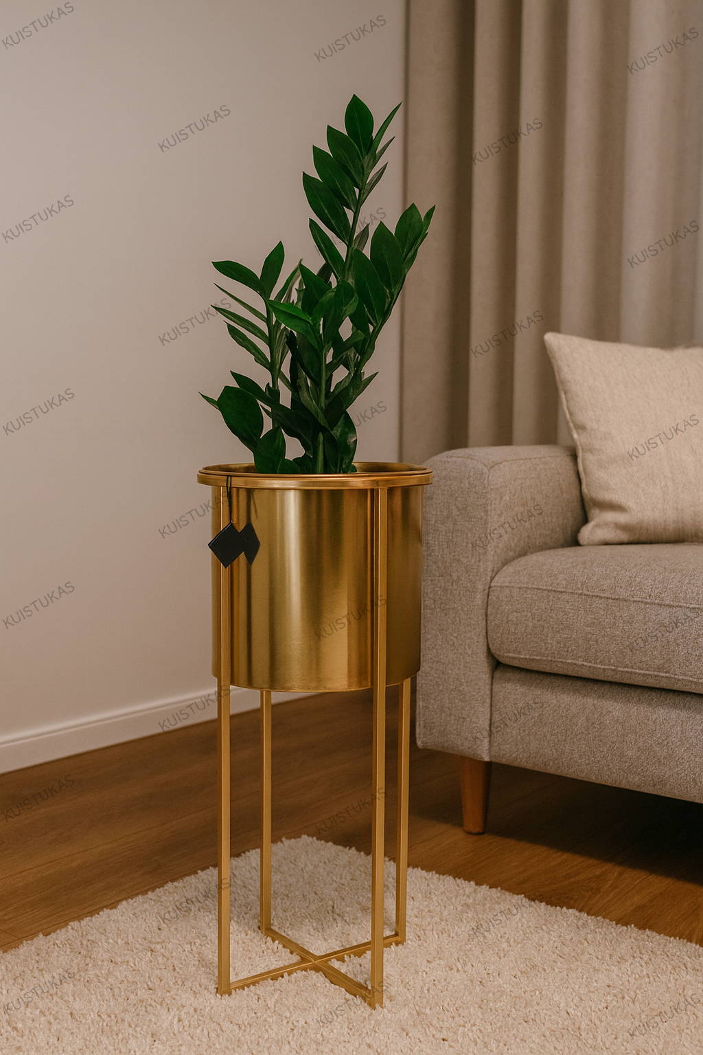 Auksinis stovas su vazonu – tai išskirtinė interjero detalė, suteikianti prabangos ir modernumo bet kokiai erdvei.