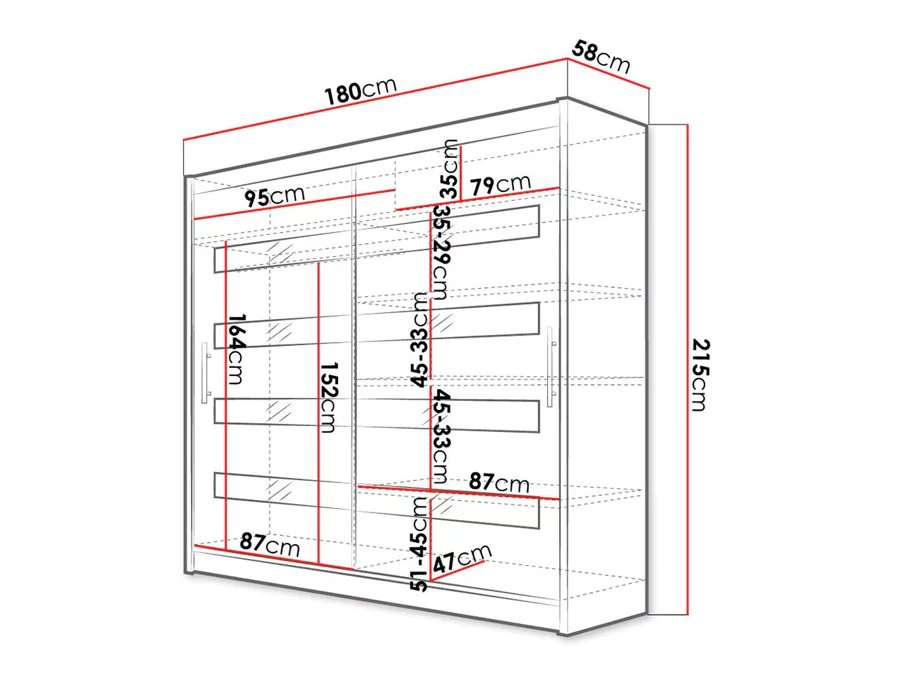 Spintos matmenys – 180x58x215 cm – pakankamai vietos visiems jūsų daiktams, tačiau išlaiko kompaktišką formą, todėl puikiai tinka tiek miegamajame, tiek prieškambaryje ar net biuro erdvėje.