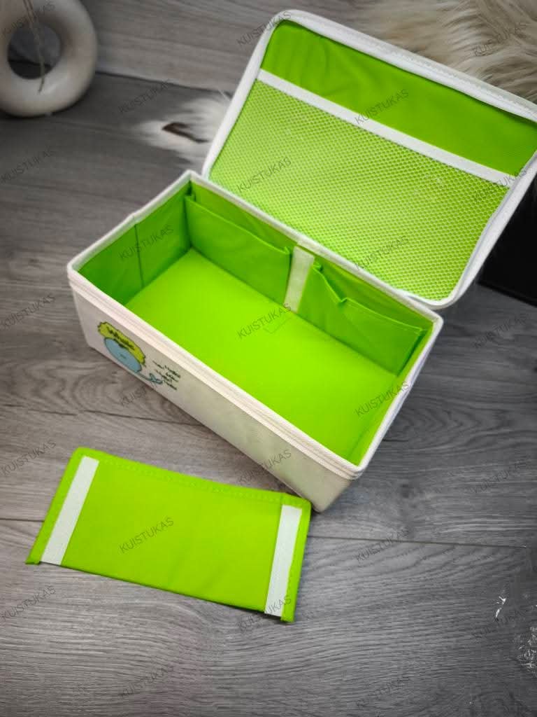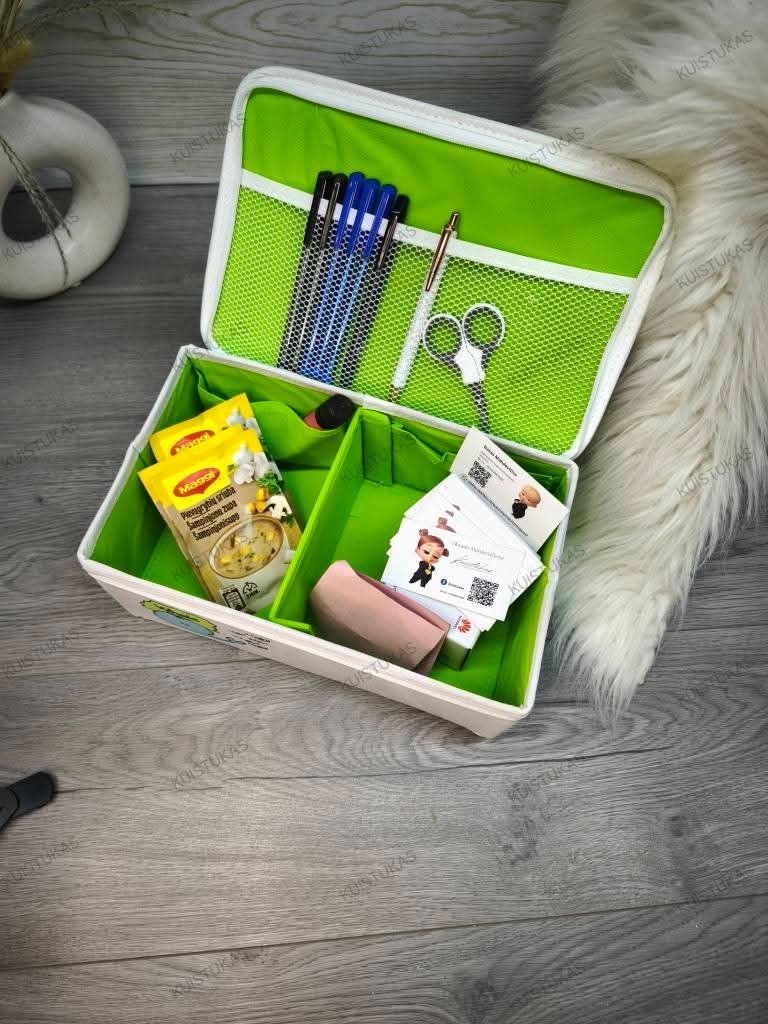 Vidus ryškios žalios spalvos suteikia žaismingumo, o patogus užtrauktukas užtikrina, kad joje laikomi daiktai bus apsaugoti nuo dulkių ar išbyrėjimo.