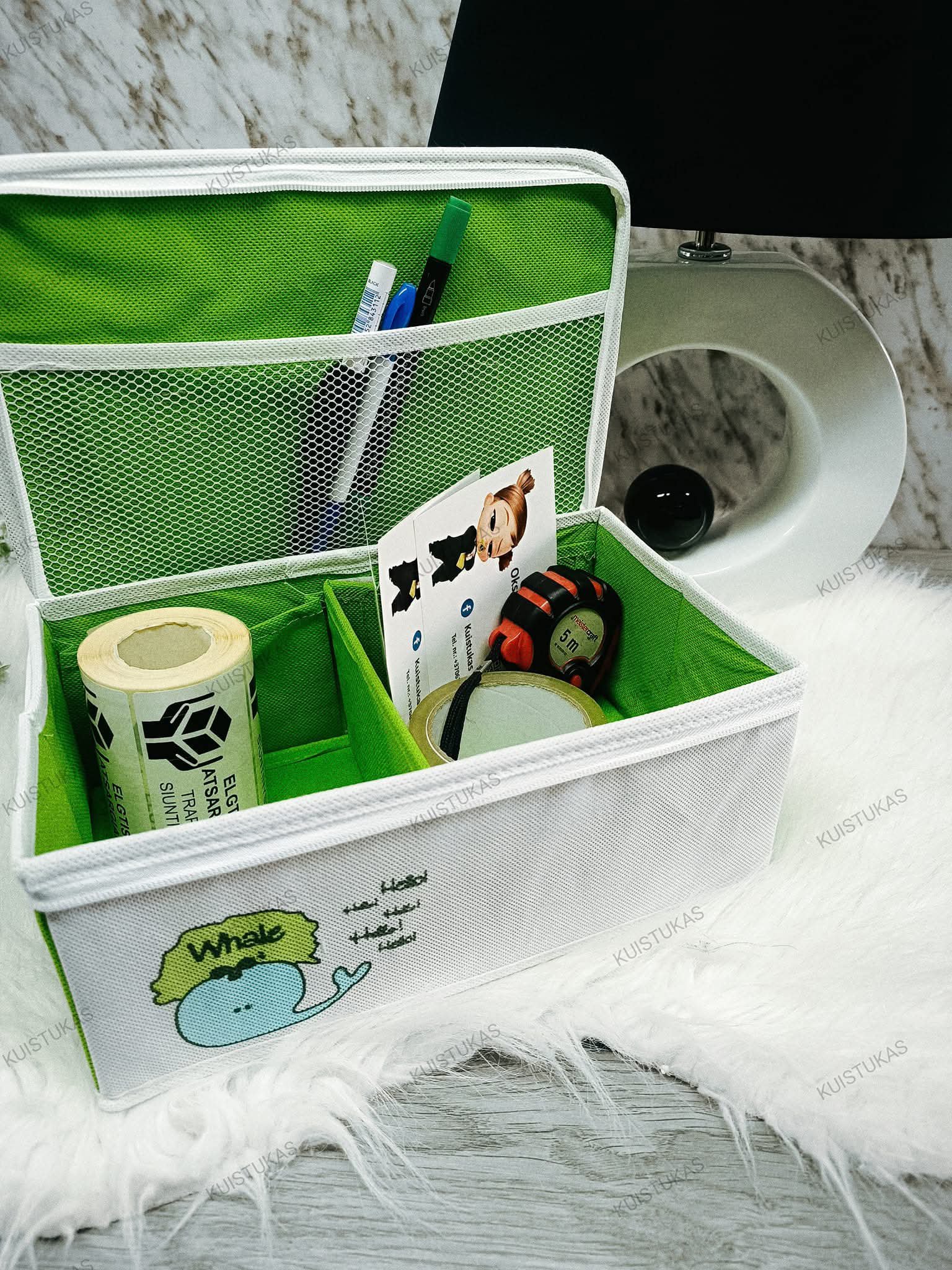 Dėžėje įmontuoti pertvaros leidžia patogiai suskirstyti stebėjimą – tai puikus pasirinkimas mokyklinėms priemonėms, aksesuarams, kosmetikai, žaislams ar kitiems smulkiems daiktams laikyti.