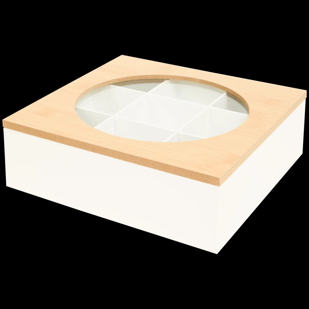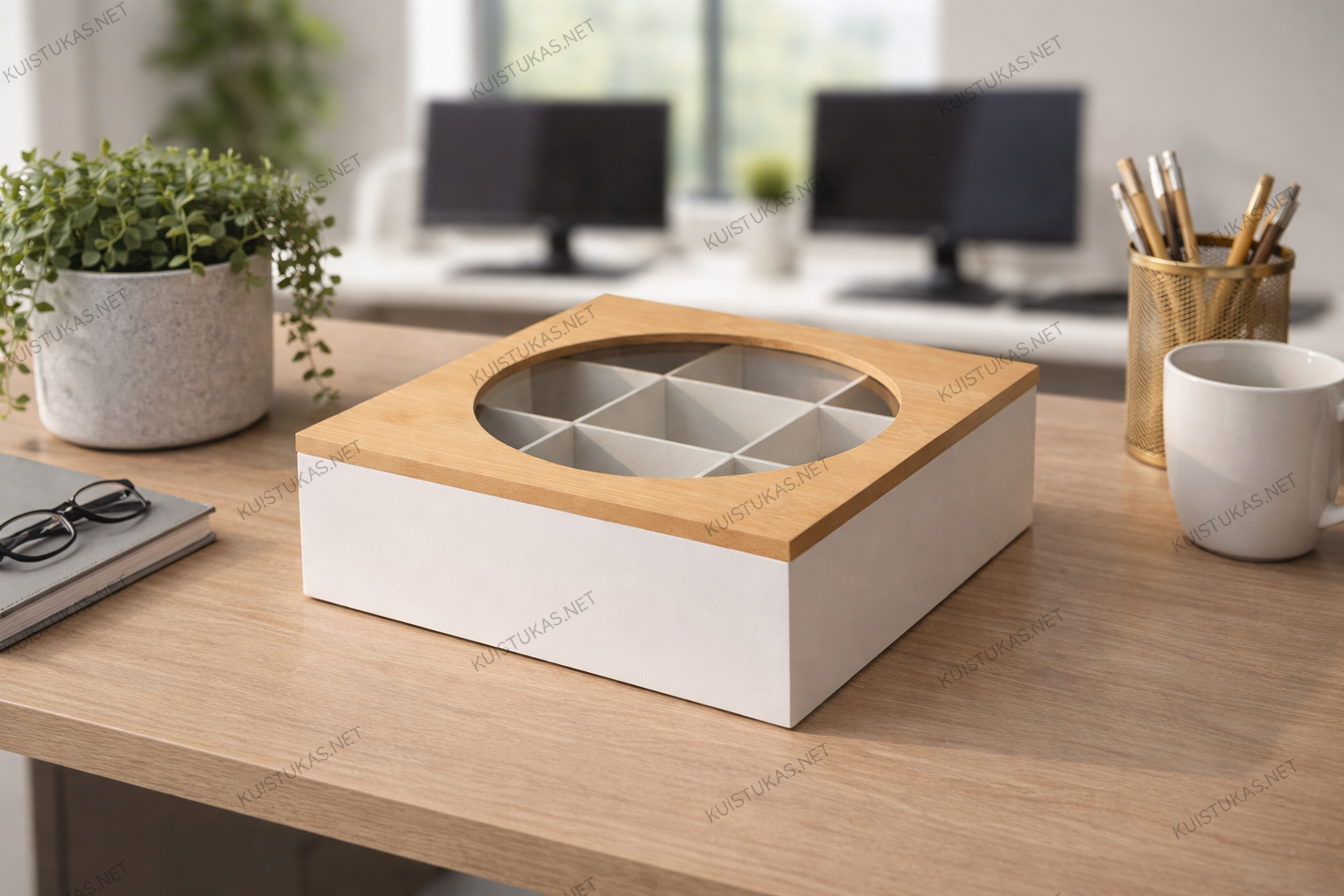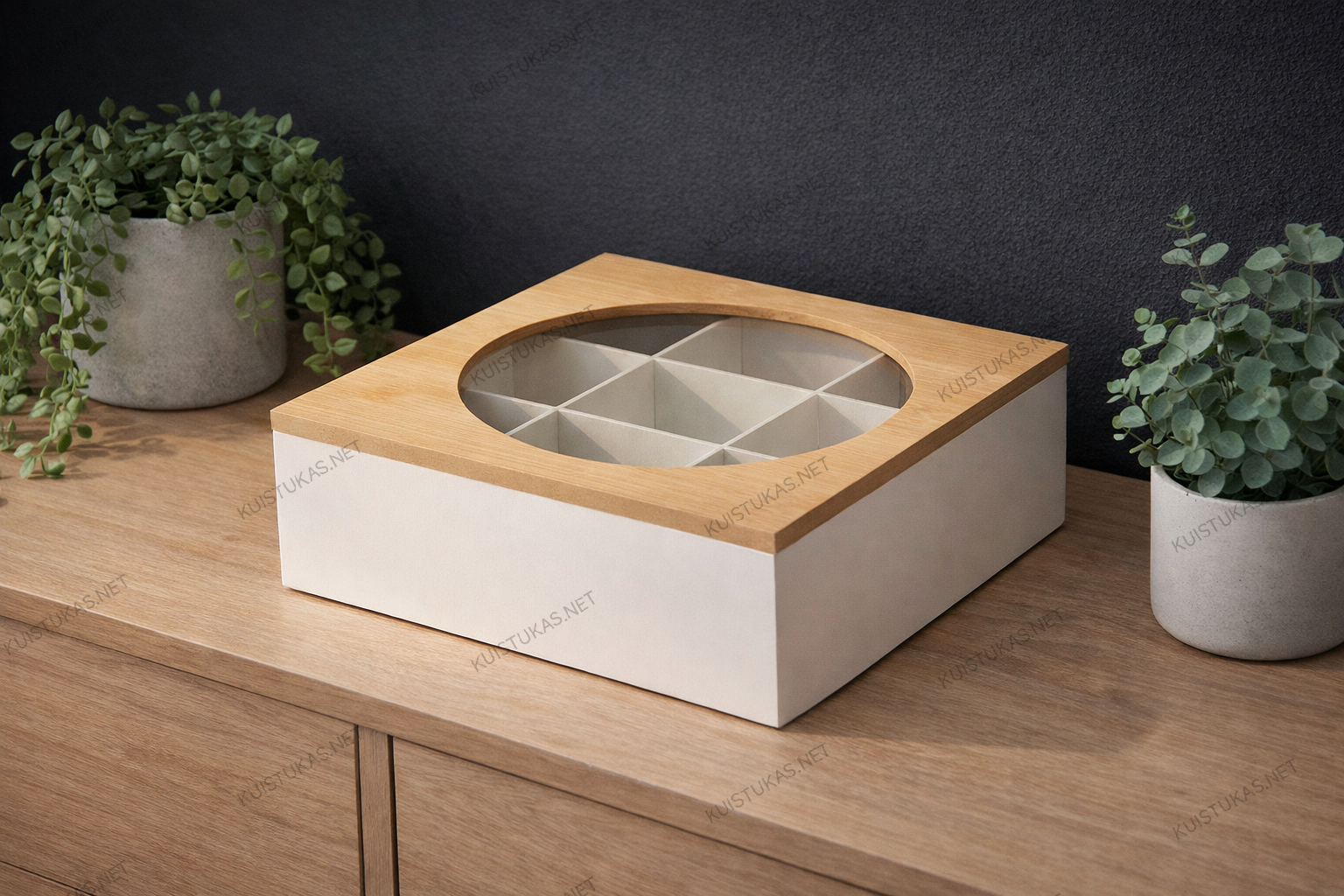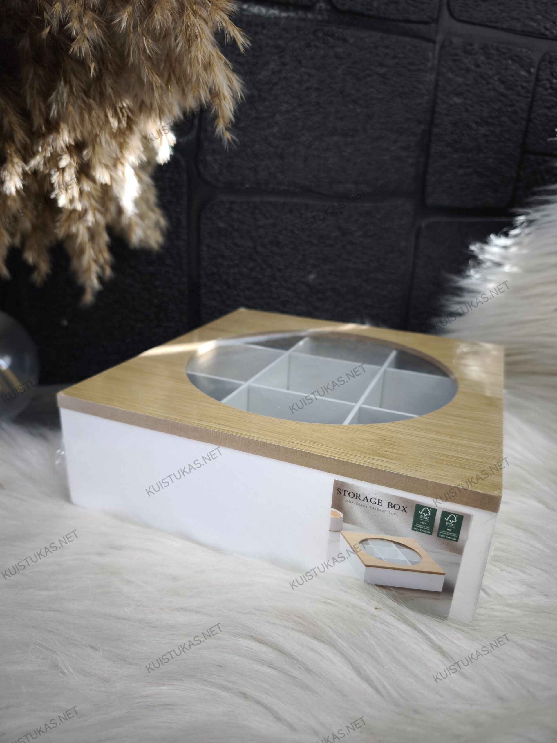 Ši universali dėžutė su skyreliais puikiai tinka arbatos pakeliams, papuošalams, sagoms, siūlams, kosmetikai, biuro reikmenims, rankdarbių priemonėms ar kitiems smulkiems aksesuarams.