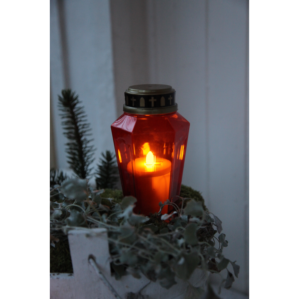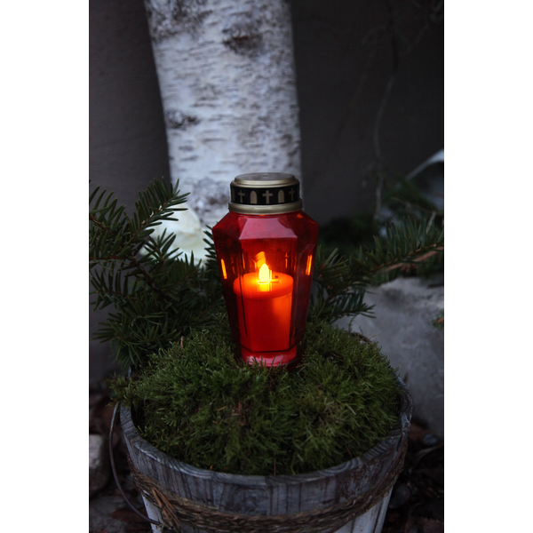Klasikinės raudonos spalvos gaubtas su metaliniu dangteliu leidžia šviesai sklįsti švelniai ir pagarbiai, suteikdamas kapavietei jaukumo ir šviesos pojūtį net vėlyvą rudenį ar žiemą.