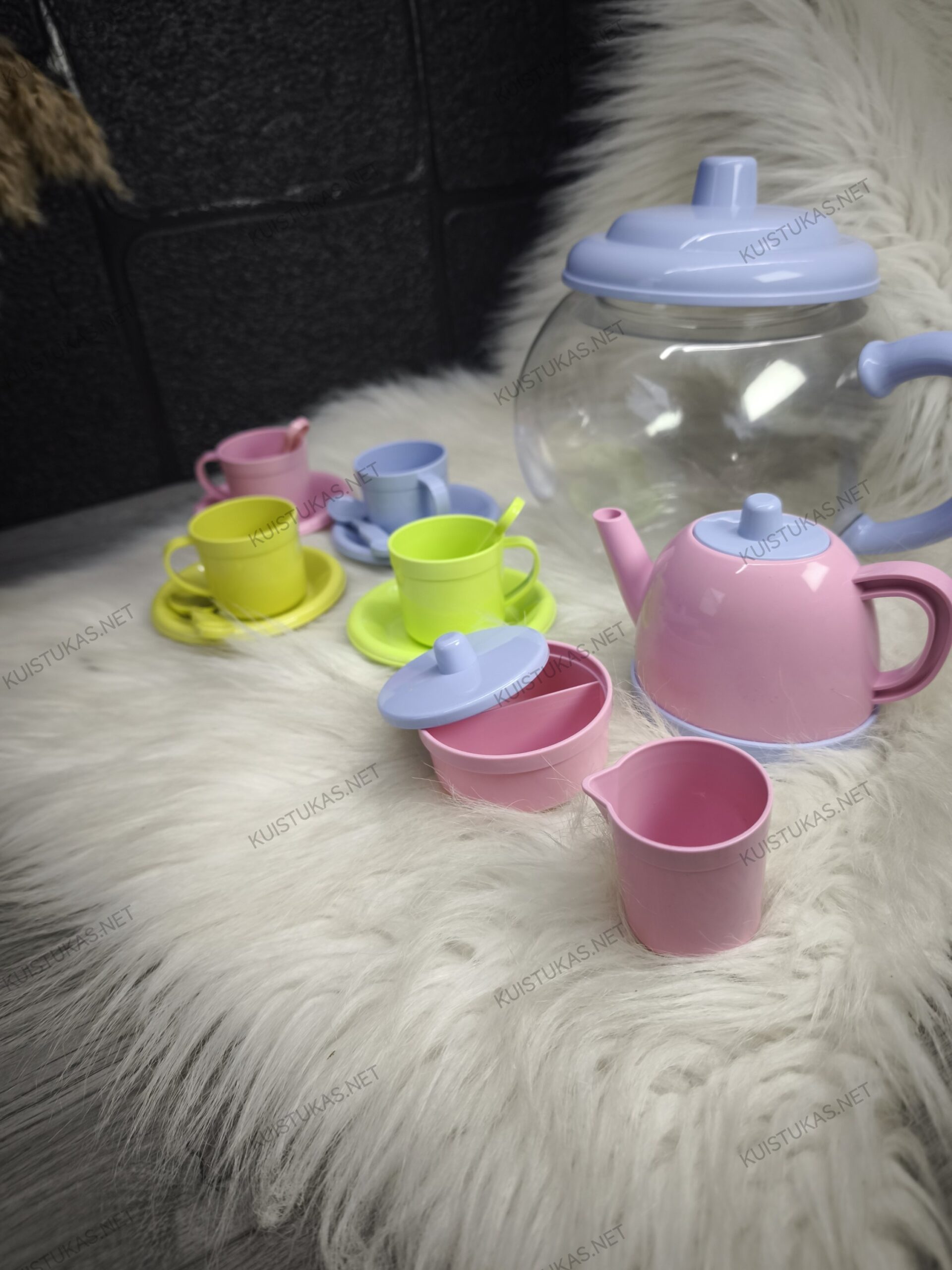 Rinkinyje rasite virdulį, arbatos puodelius su lėkštutėmis, cukrinę, pieno ąsotėlį ir kitus reikalingus priedus, kad vaikas galėtų surengti tikrą žaislinę arbatėlę.