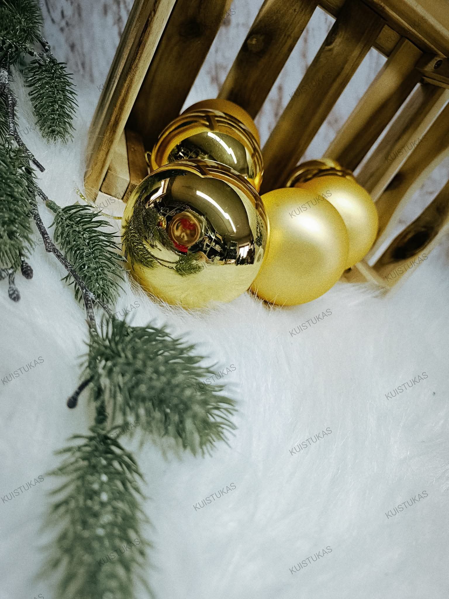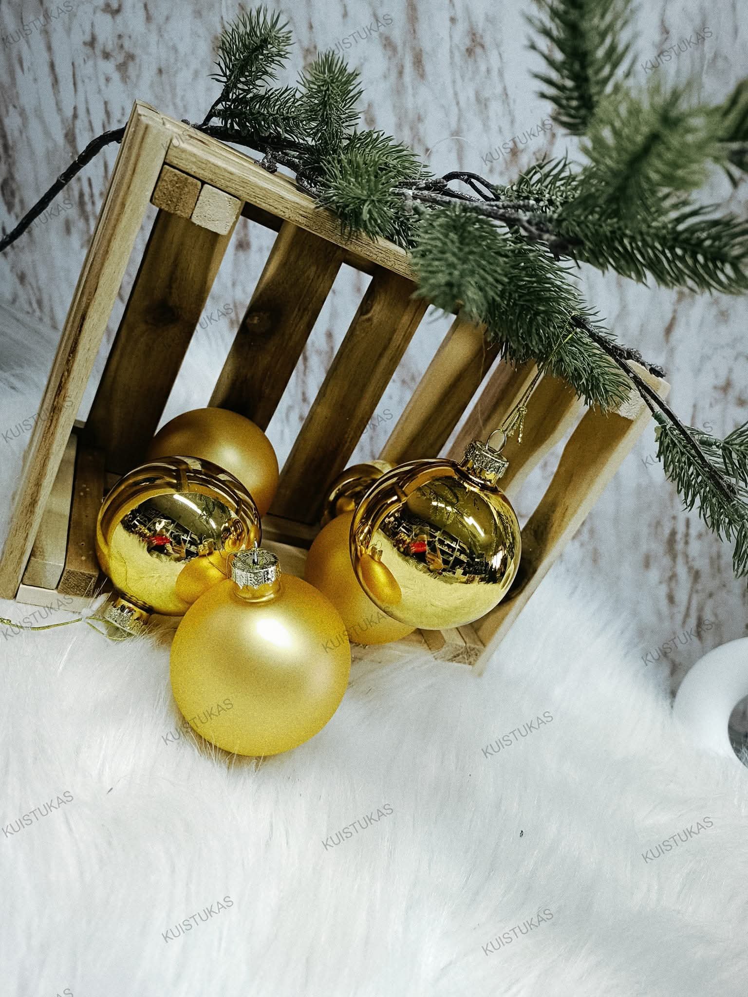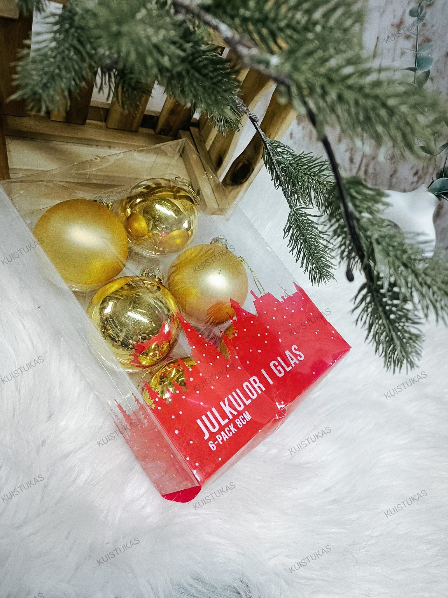 Šiame rinkinyje rasite 6 vienetus auksinės spalvos žaisliukų, kurių kiekvieno skersmuo yra 6 cm – tai universalus dydis, puikiai tinkantis tiek stambesnėms eglėms, tiek mažesnėms dekoratyvinėms eglutėms ar kompozicijoms namuose.