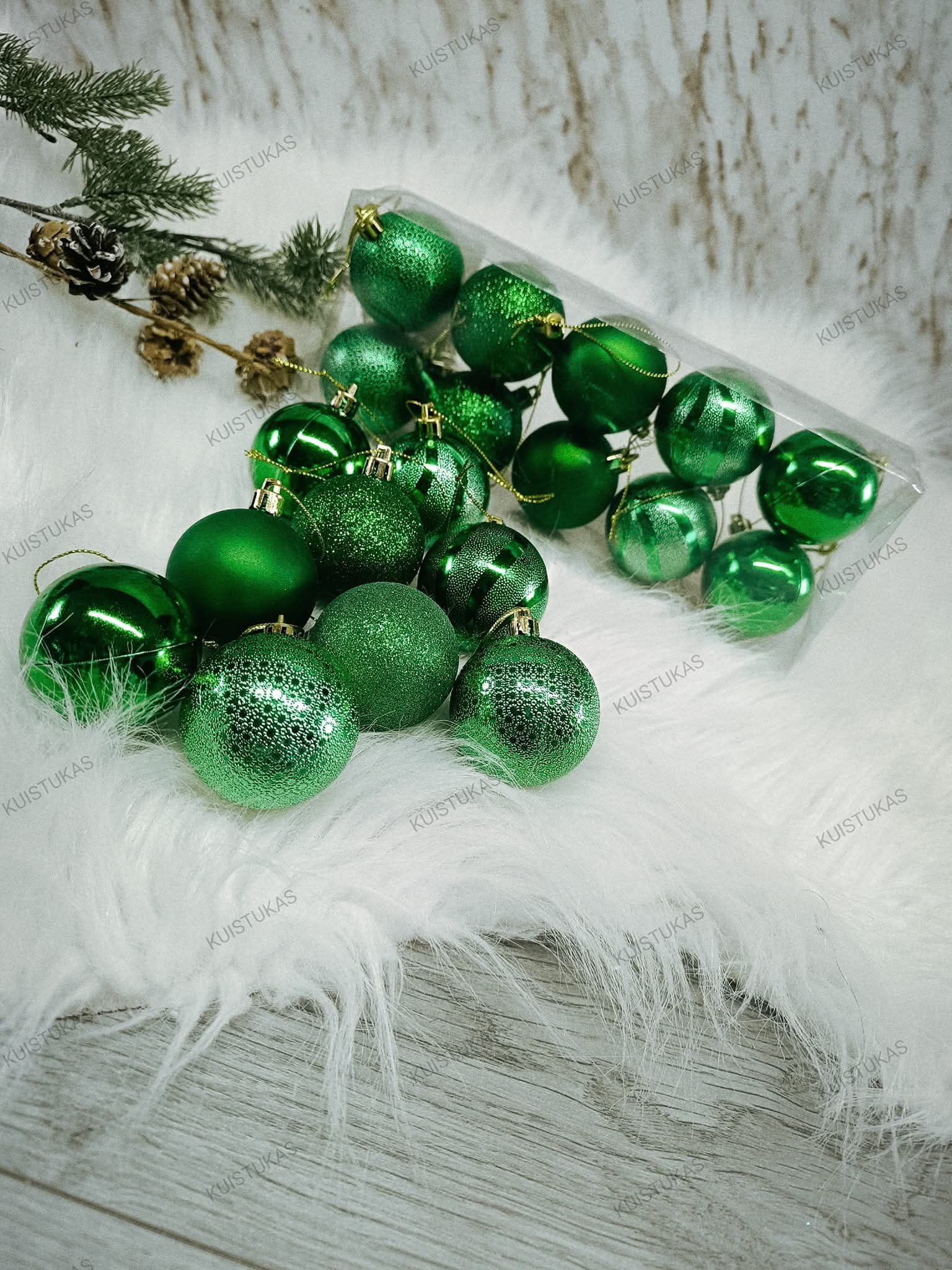 Žaisliukų komplektas „Mini green“ – tai stilingas ir praktiškas pasirinkimas jūsų Kalėdų eglutės papuošimui.