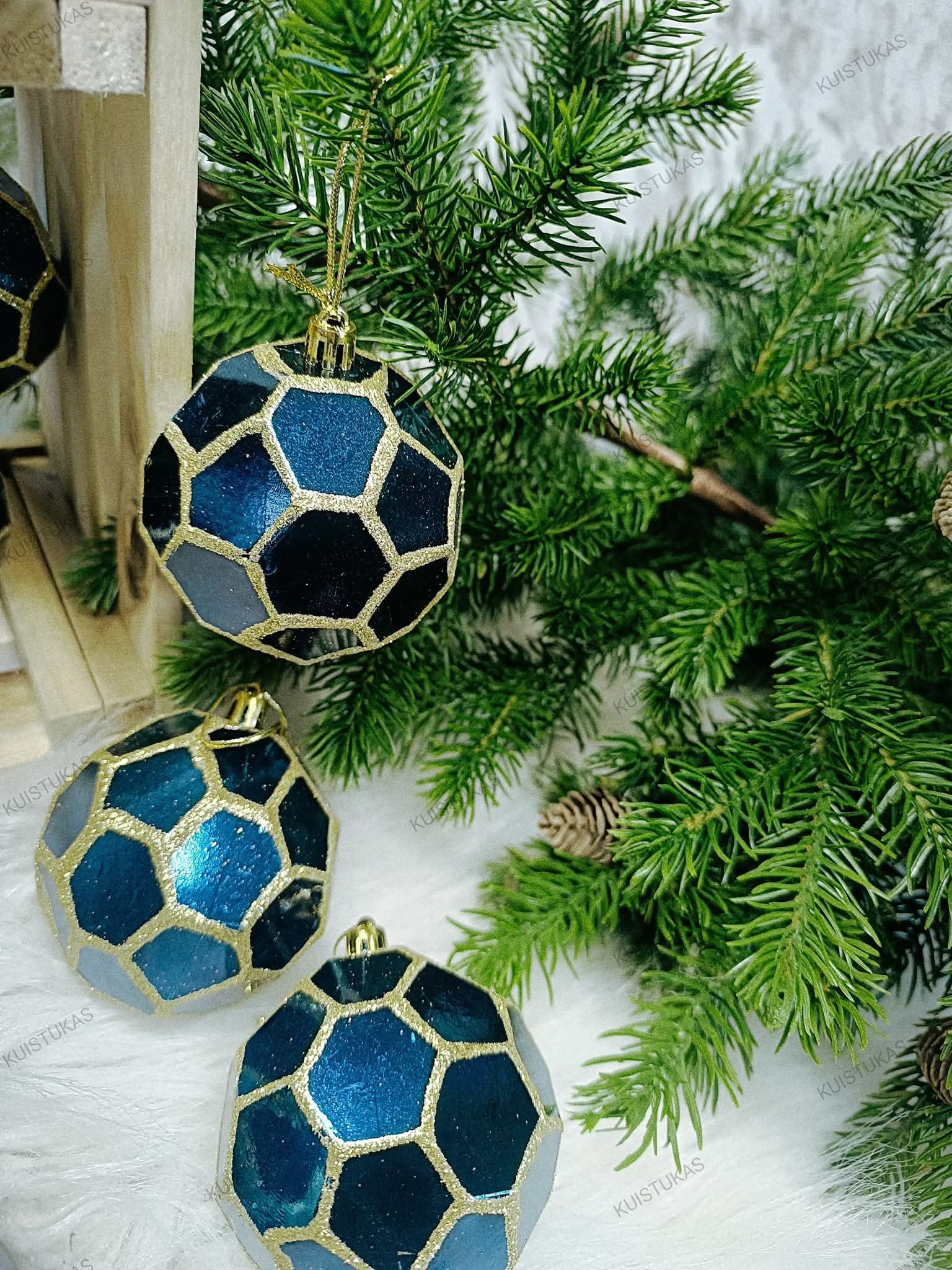 Rinkinį sudaro 3 vienetai tamsiai mėlynų žaisliukų, dekoruotų aukso spalvos geometriniu raštu, kuris subtiliai atspindi šviesą ir sukuria žėrintį efektą.