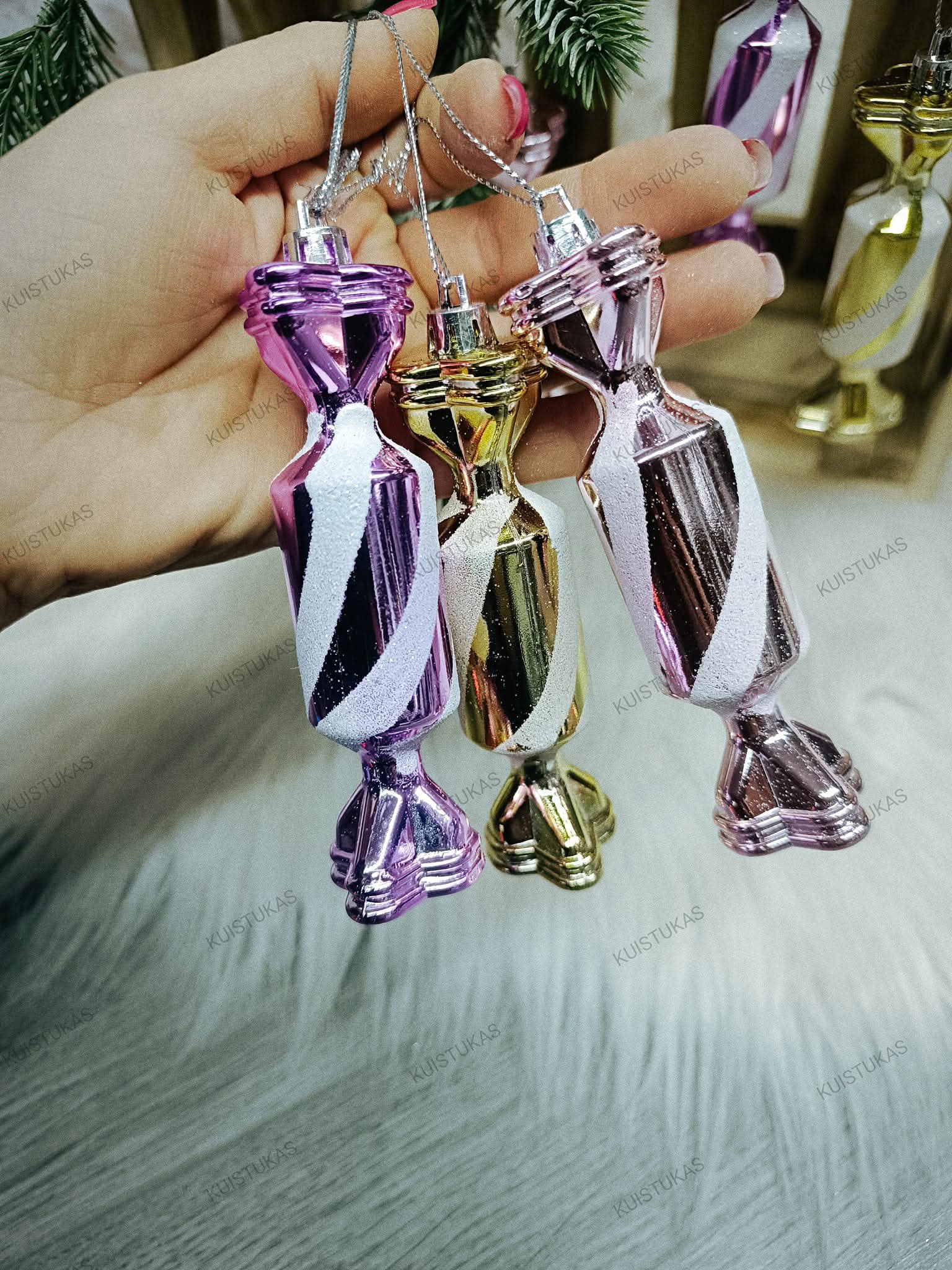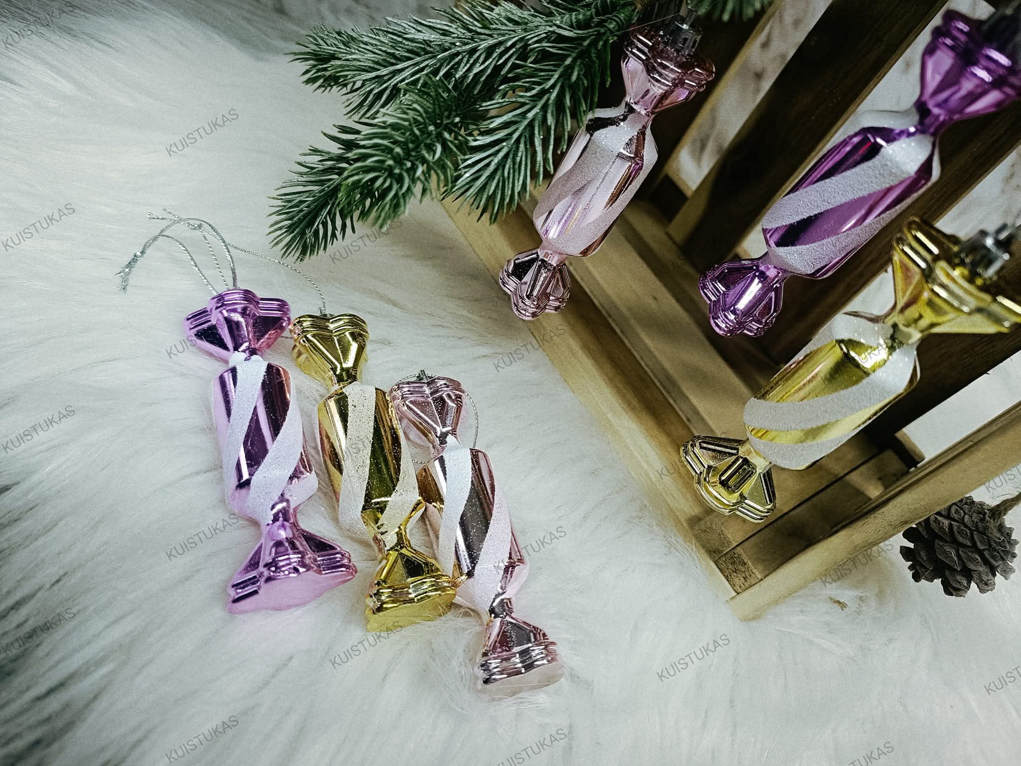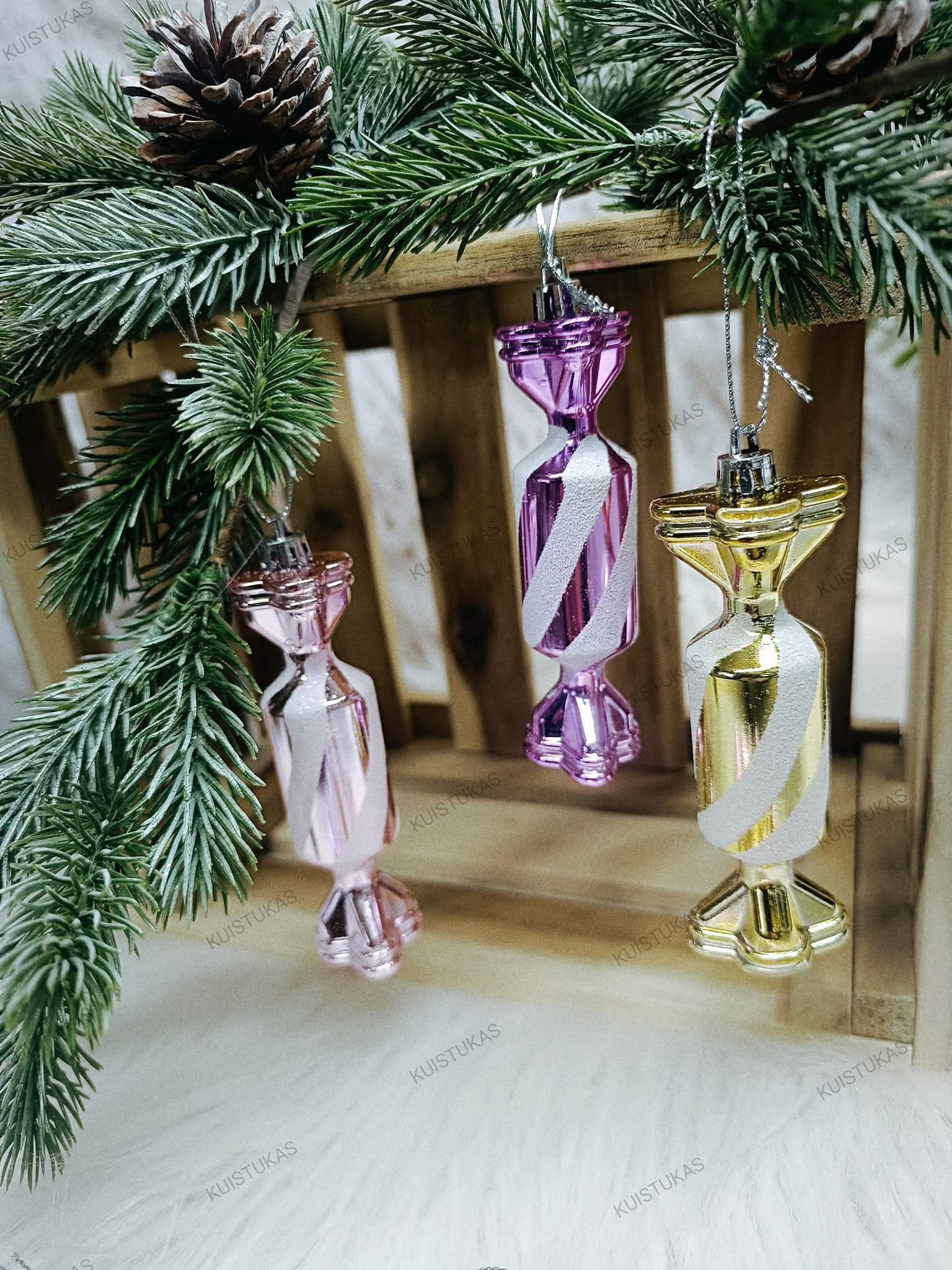 Šie saldainio formos žaisliukai yra puikus pasirinkimas tiems, kurie nori Kalėdų eglutę papuošti originaliai, žaismingai ir kartu stilingai.