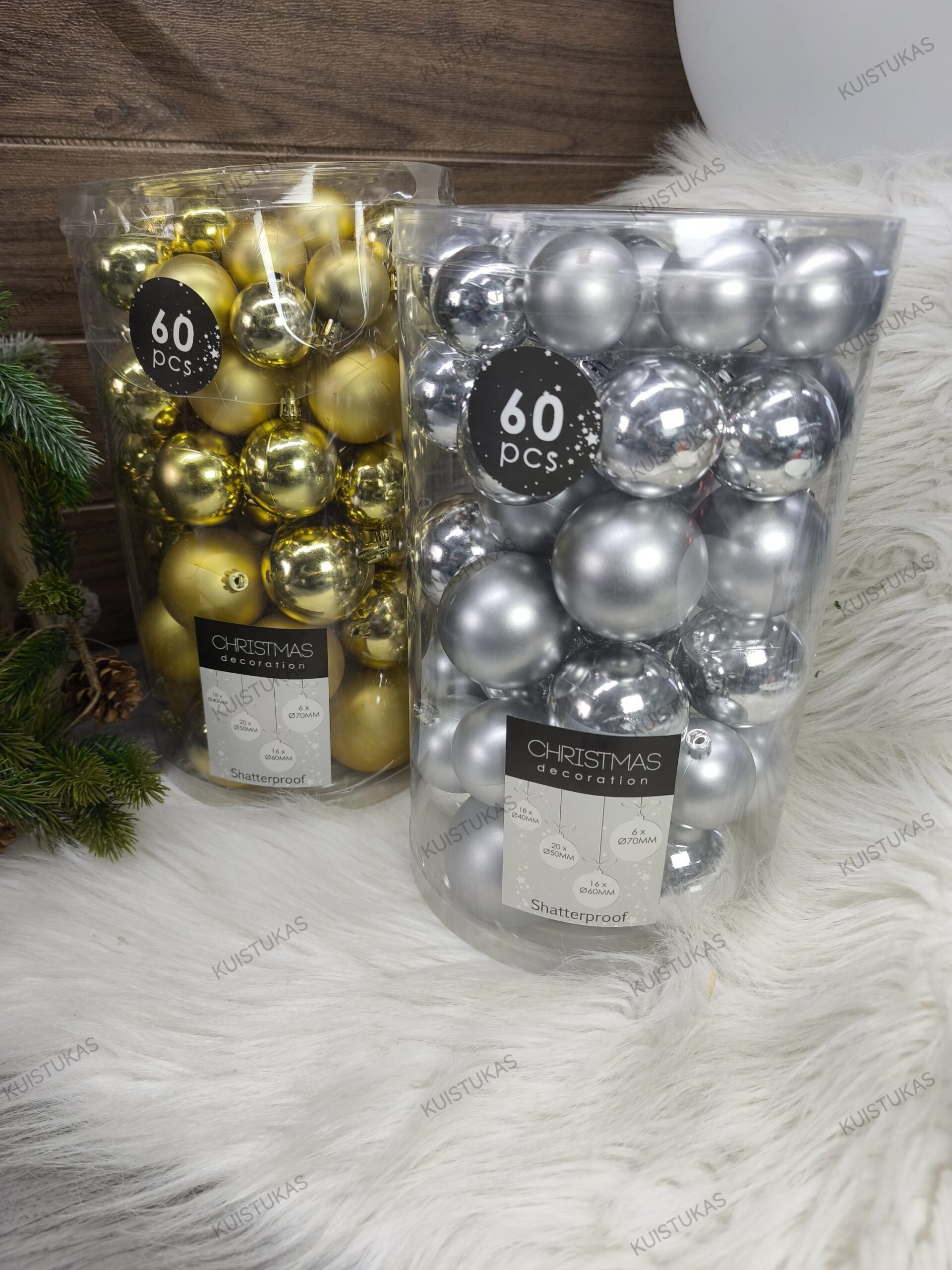 Komplekte yra net 60 vienetų įvairių dydžių žaisliukų, kurie leis papuošti eglutę harmoningai ir suteiks jai išskirtinio žavesio.