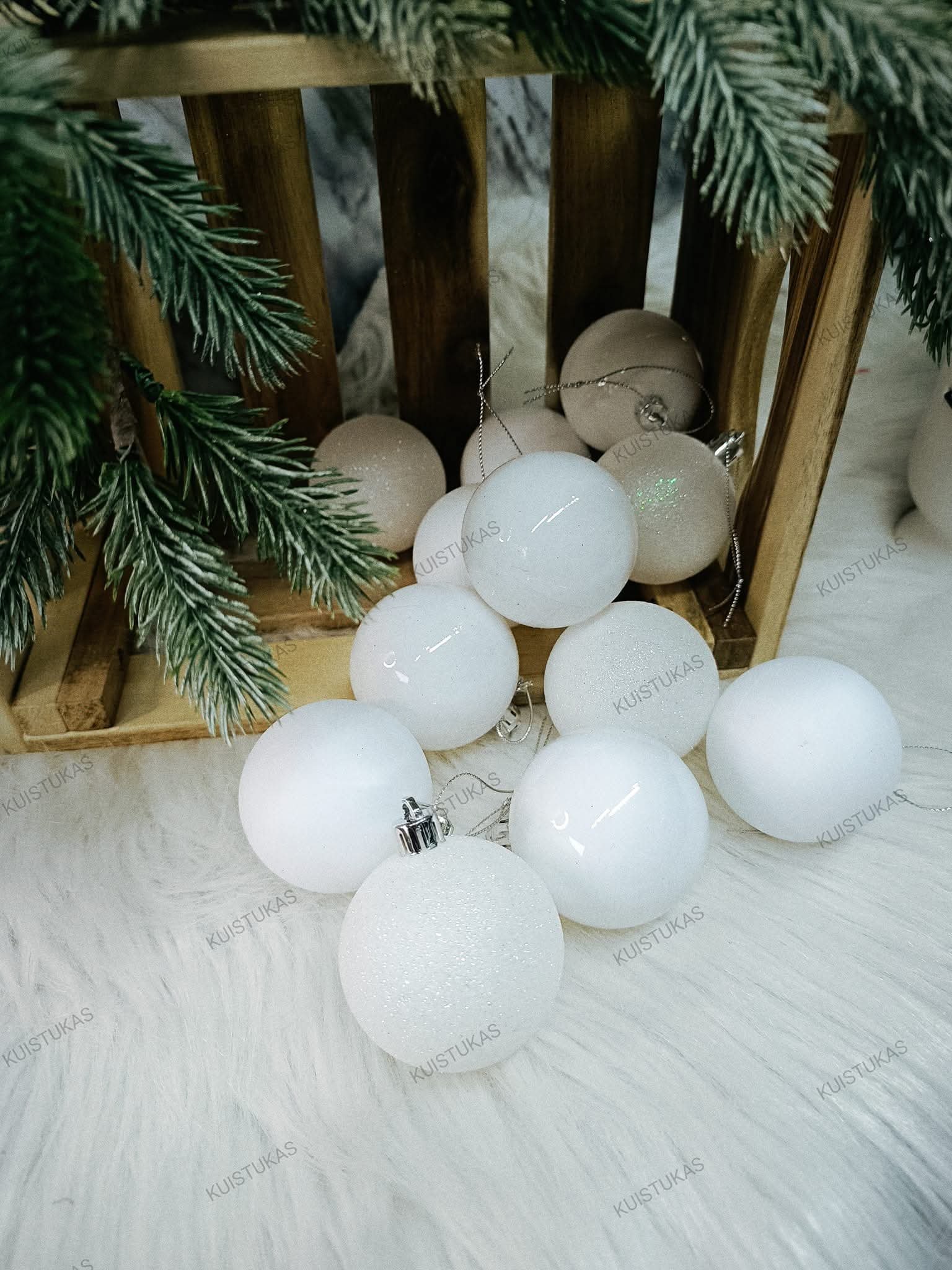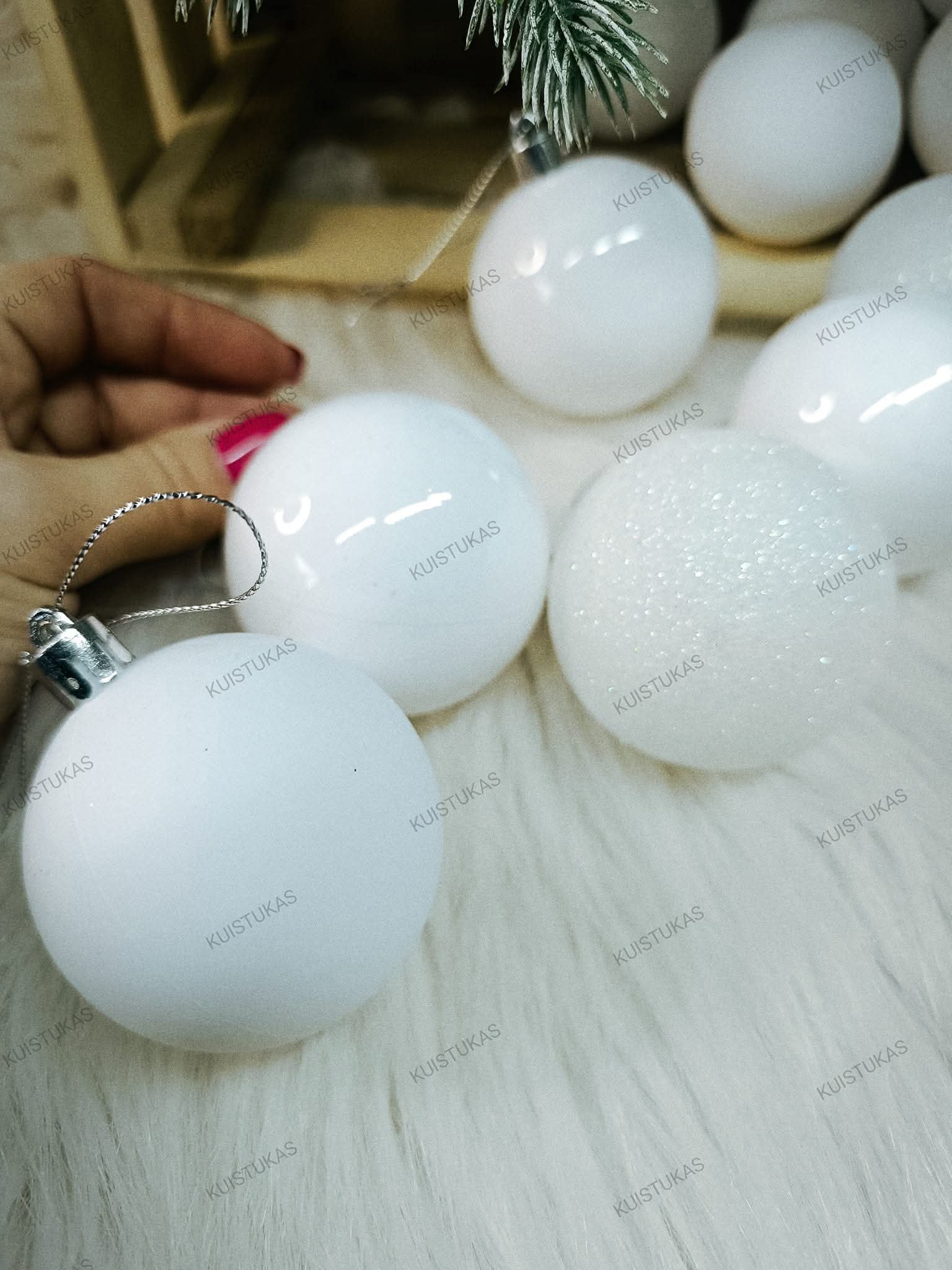 Rinkinyje rasite net 12 vnt. baltos spalvos žaisliukų, kurių kiekvieno skersmuo 6 cm.