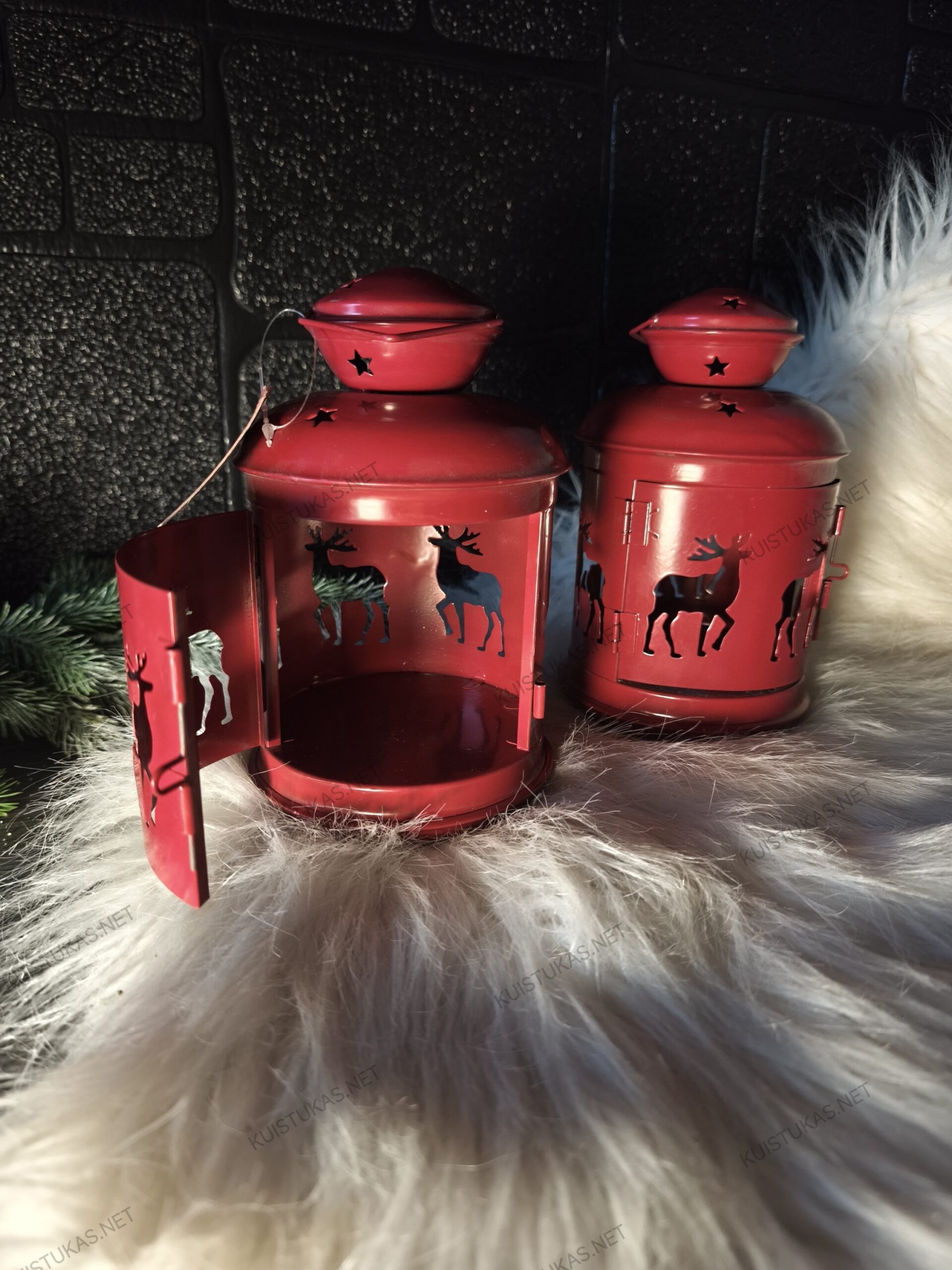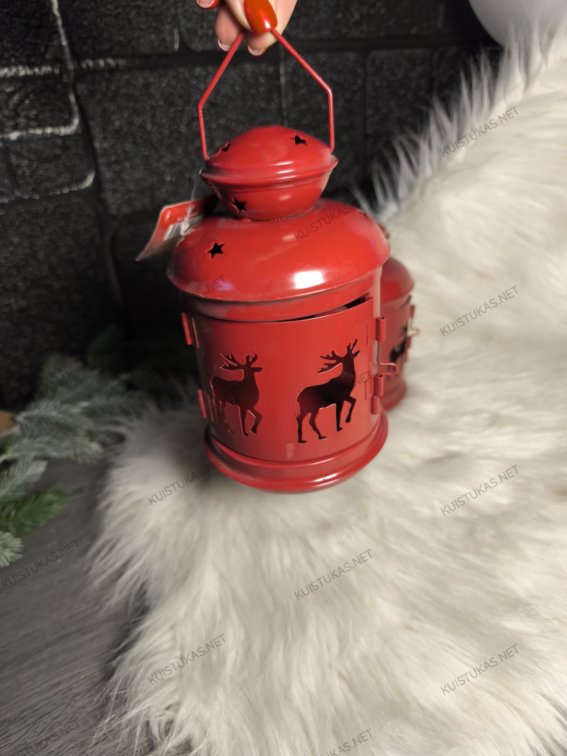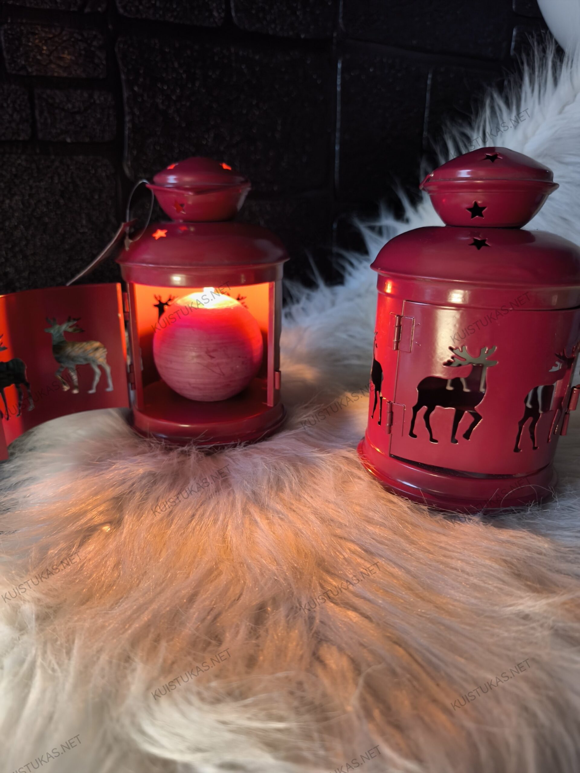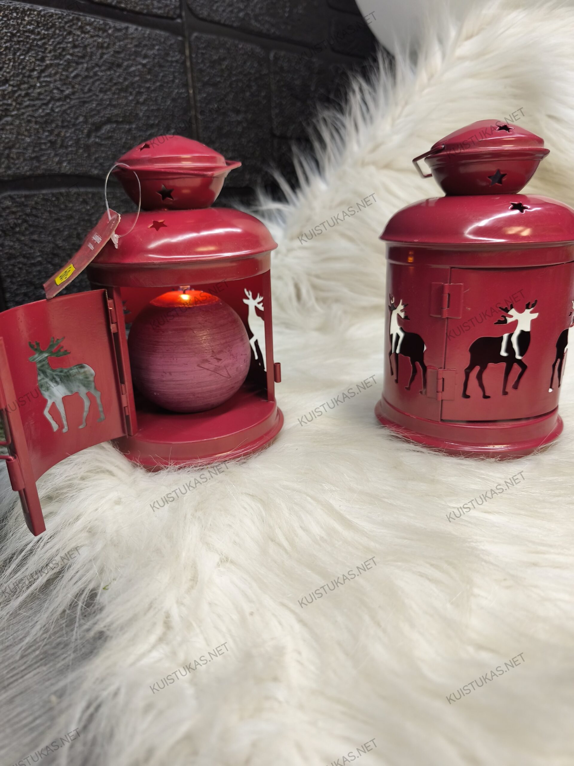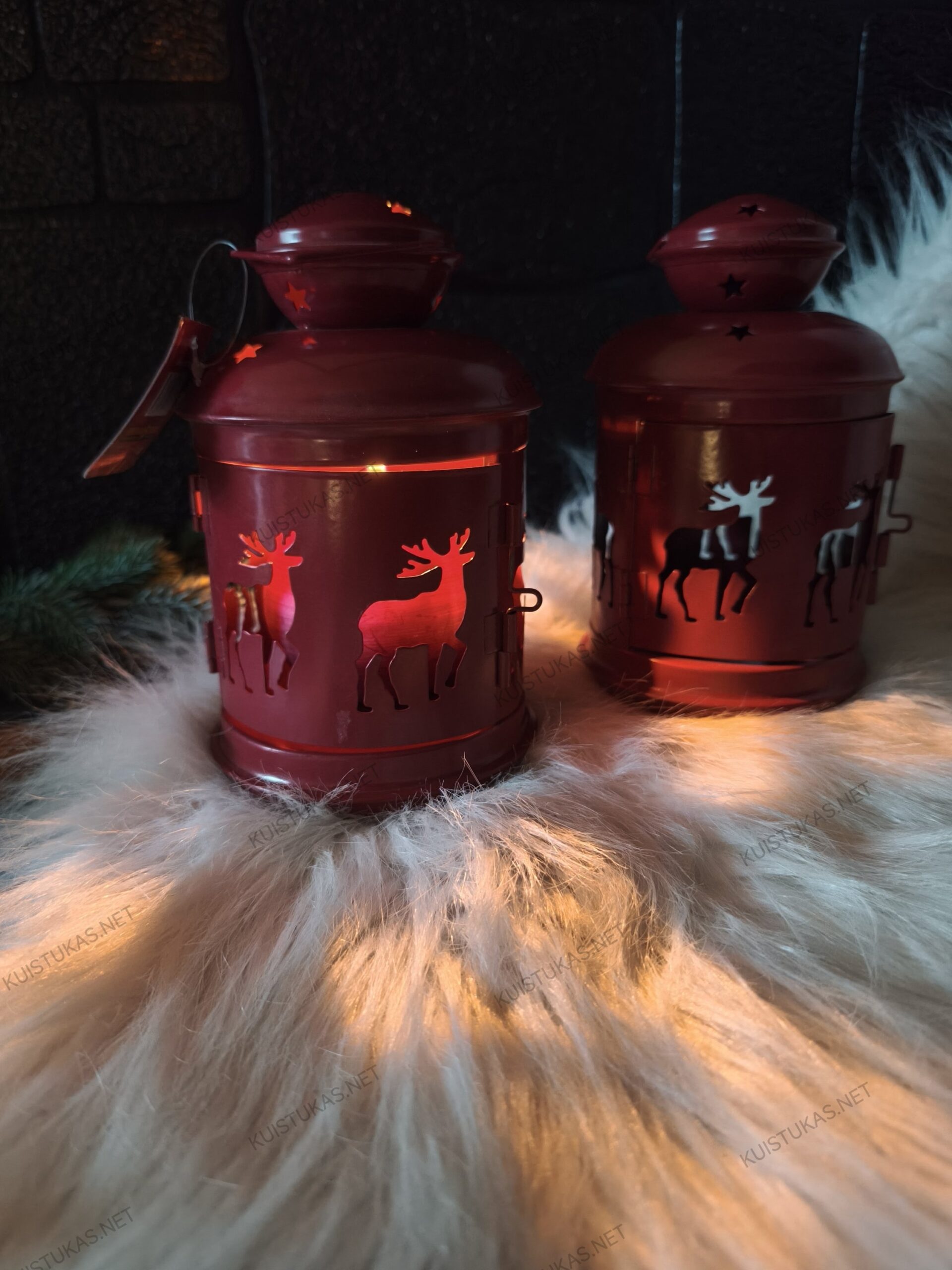 Raudonas metalo korpuso atspalvis, kruopščiai išpjaustyti elnių siluetai ir minkštai praleidžiama šviesa sukuria ypatingą atmosferą, kuri puošia tiek namų interjerą, tiek terasą ar prieangį.