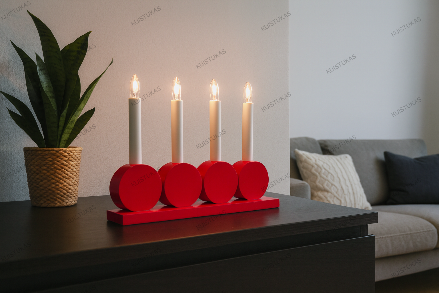 Ant pagrindo stovi keturios žvakės formos LED lemputės, kurios skleidžia šiltą ir jaukią šviesą.