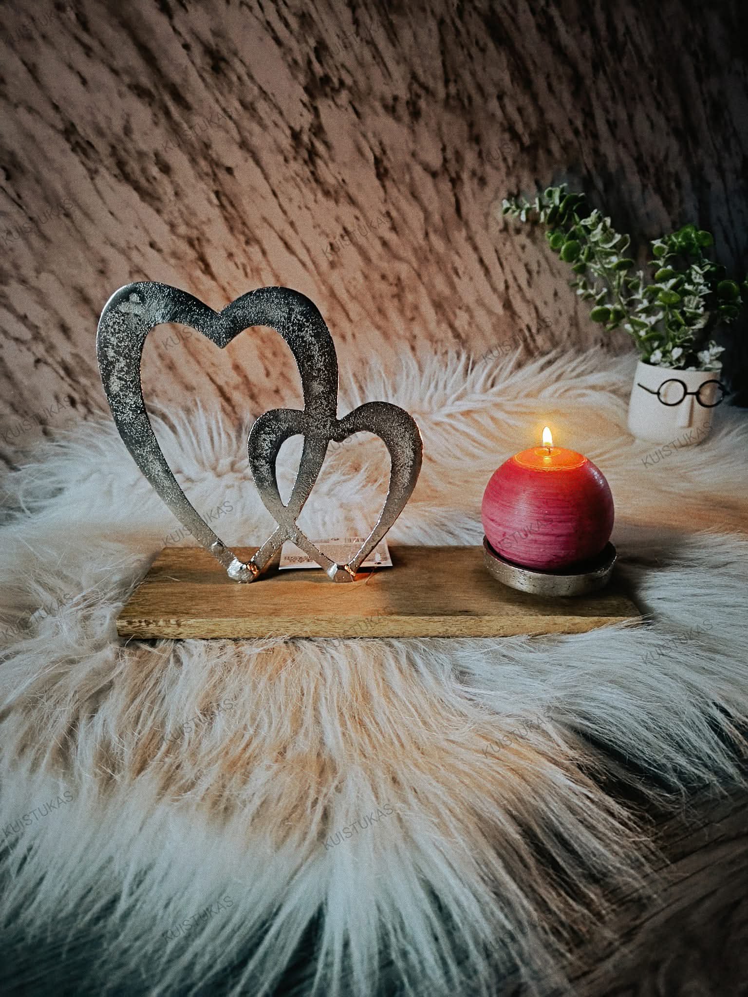 Ant medinio pagrindo stovi dviejų širdžių formos dekoras iš patvarios geležies, simbolizuojantis meilę, artumą ir ryšį.