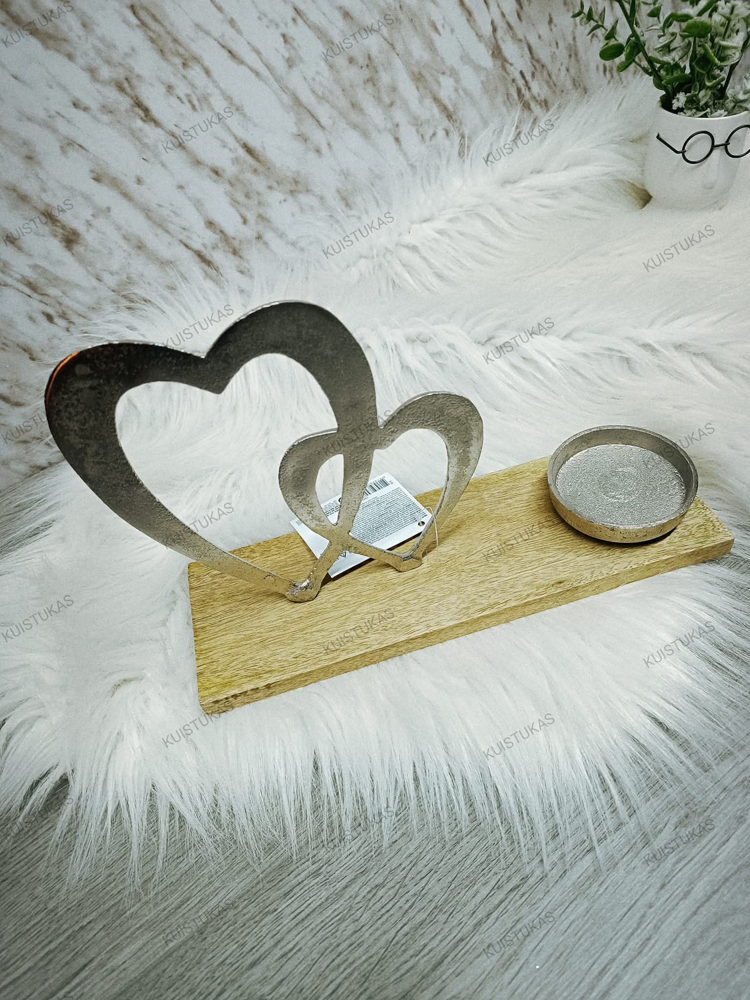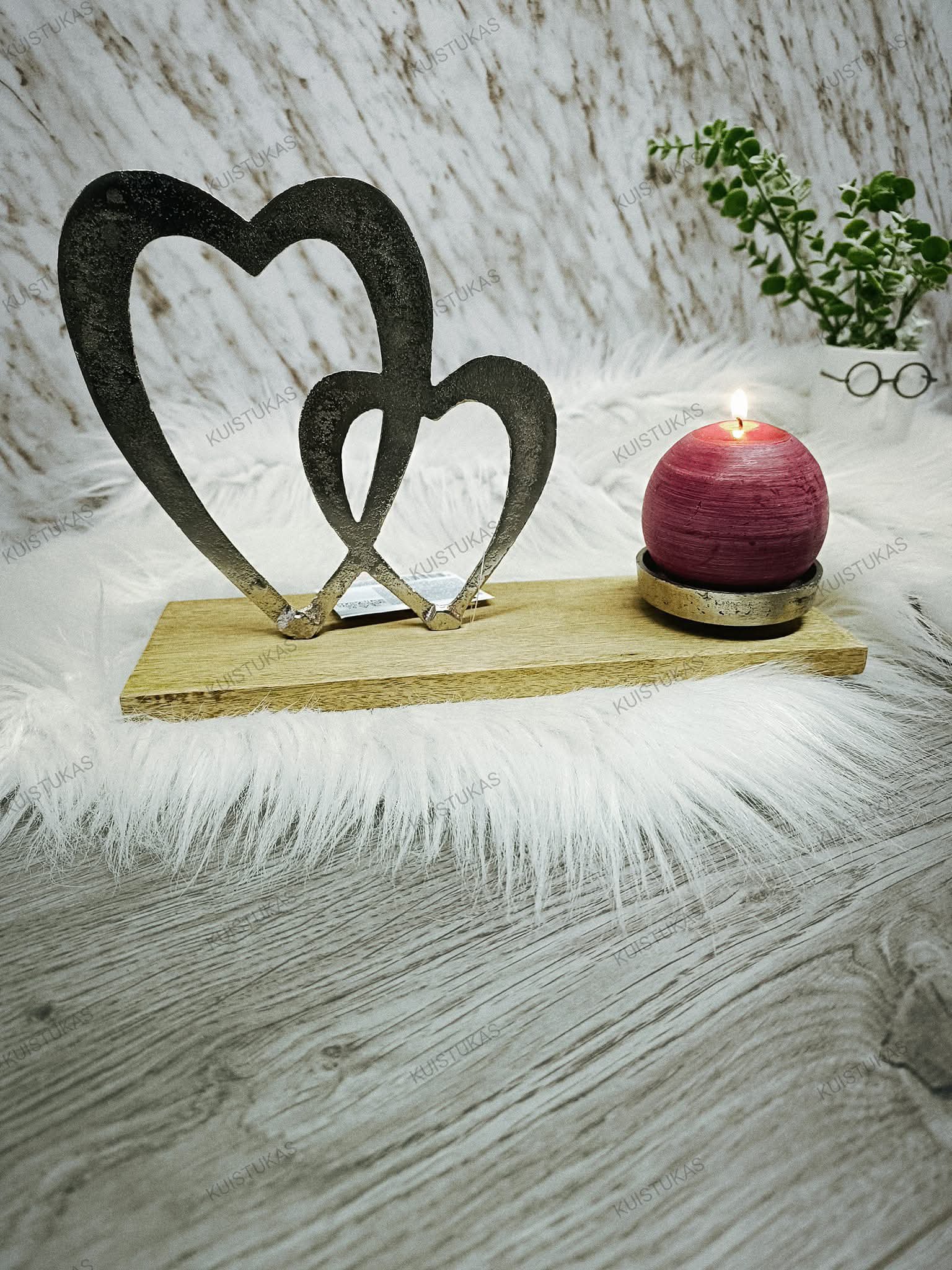 Suteikite savo namams romantišką ir šiltą atmosferą su dekoratyvine žvakide „Širdys“, kuri sujungia natūralios medienos šilumą ir elegantišką geležies tvirtumą.