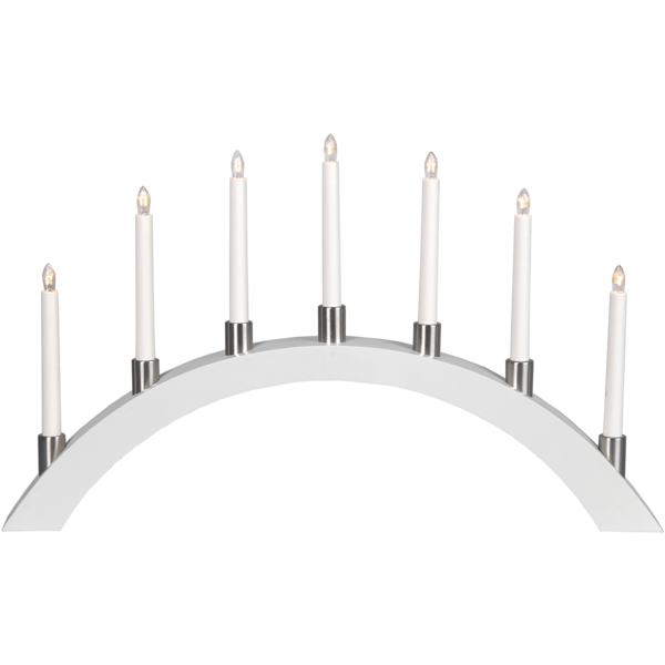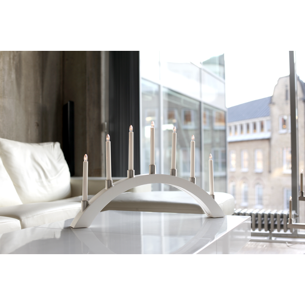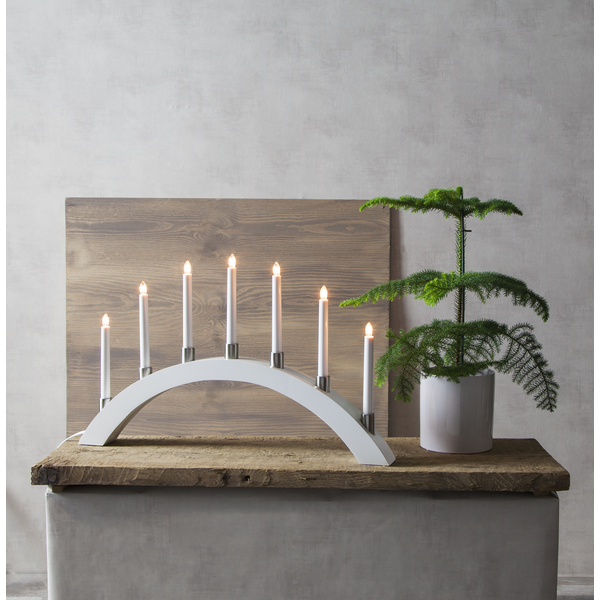 Švarios baltos spalvos pagrindas derinamas su minimalistiniais metalo akcentais, o 7 LED lemputės imituoja tradicinių žvakių liepsną, spinduliuodamos šiltą, jaukią šviesą.