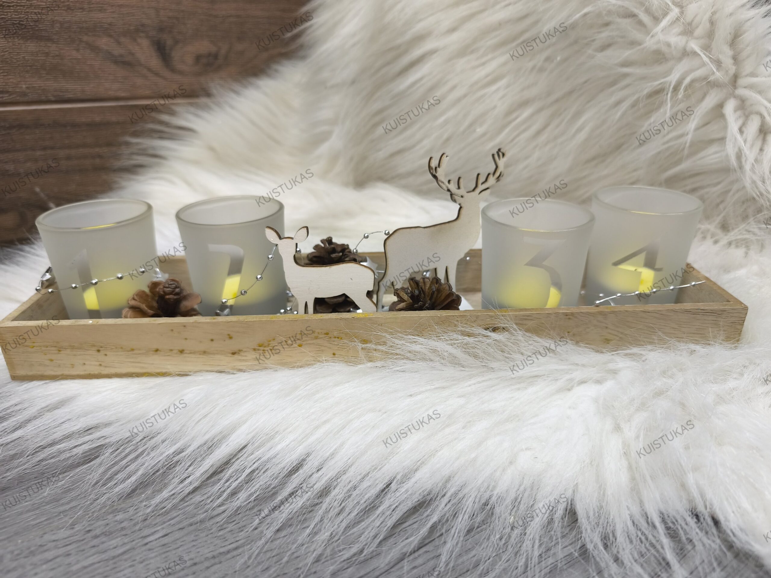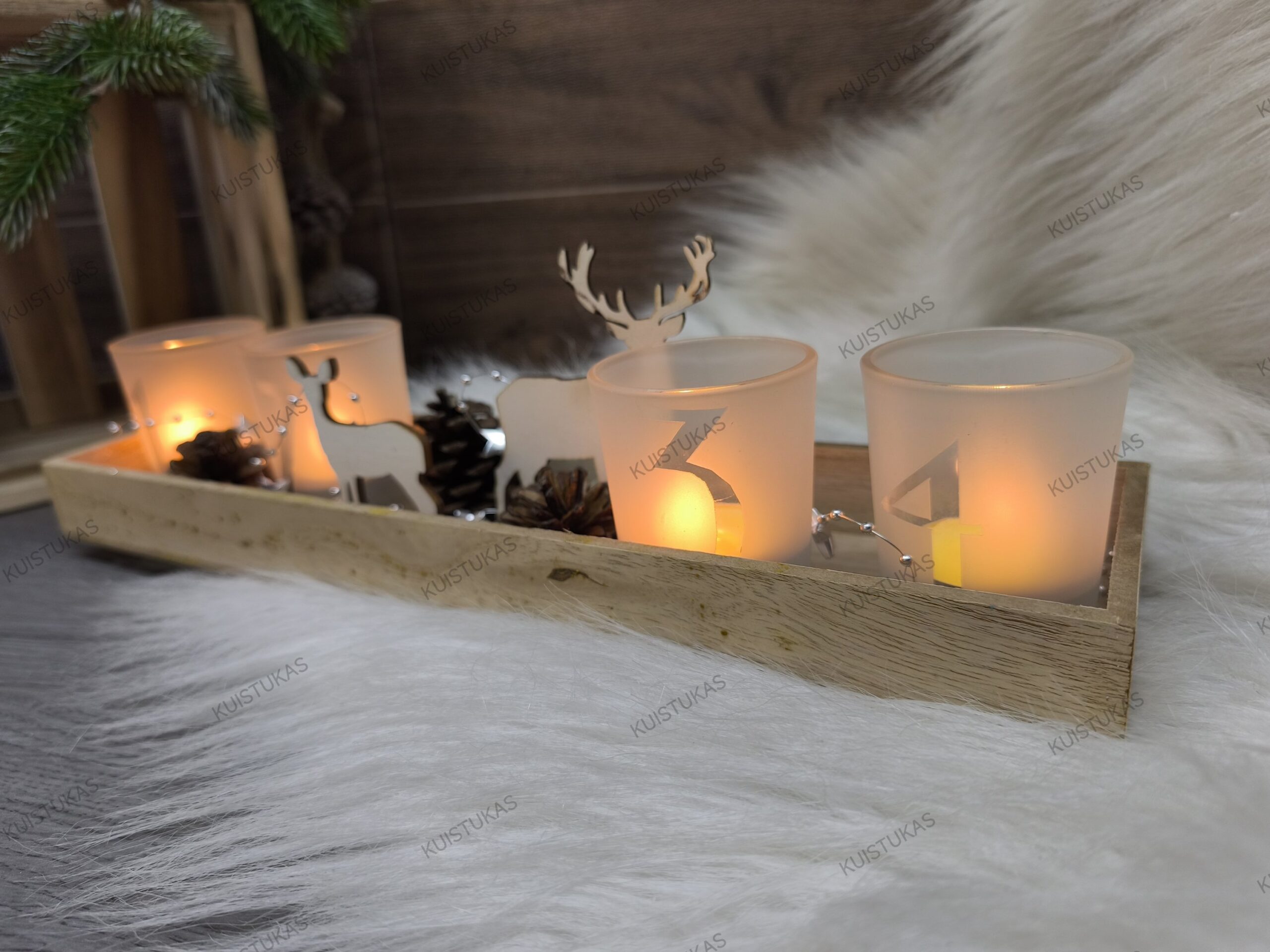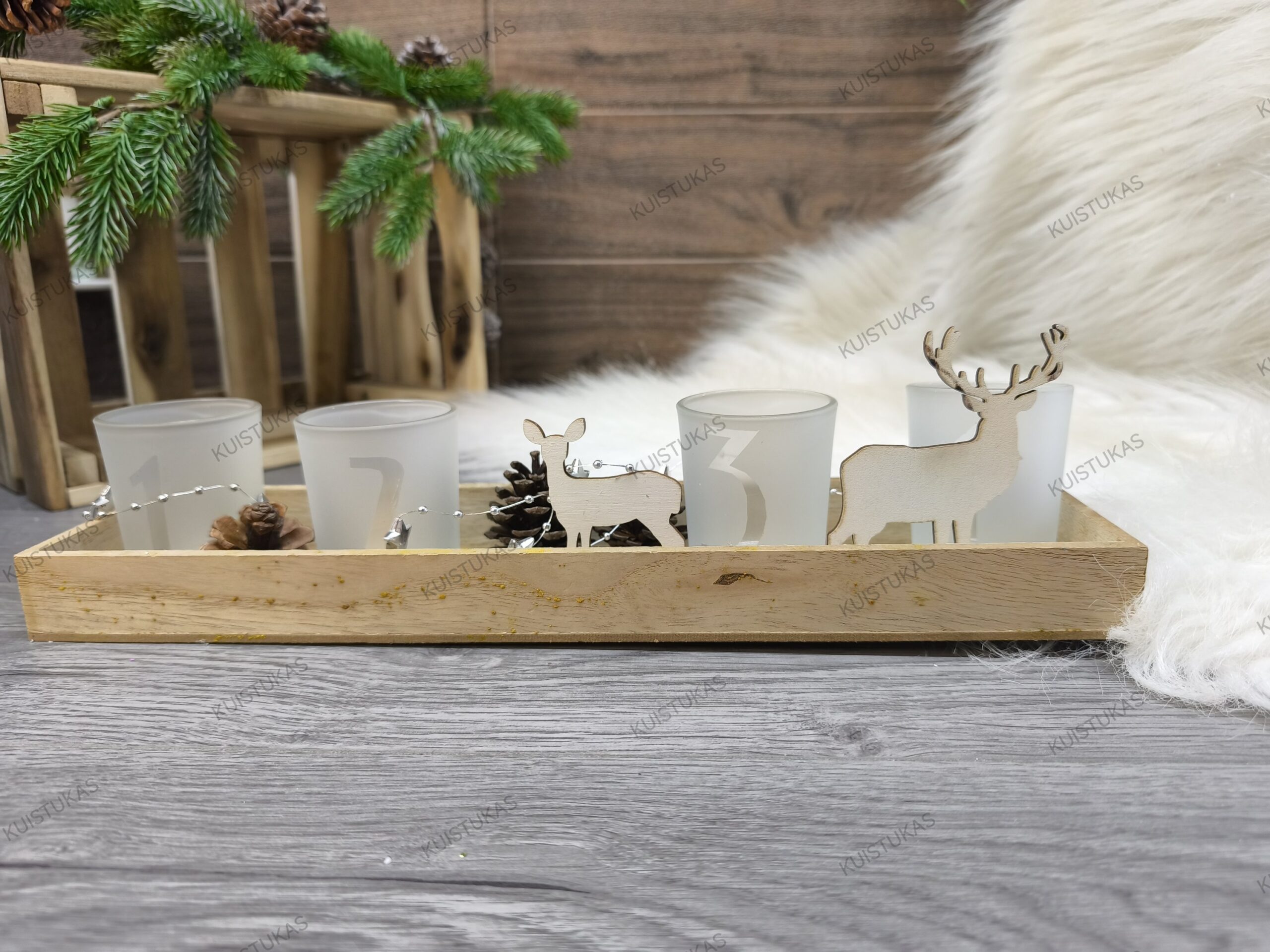 Komplektą sudaro medinis padėklas, keturios stiklinės žvakidės, dvi medinės figūrėlės, trys natūralūs kankorėžiai bei subtili girlianda, kuri papildomai papuoš kompoziciją.