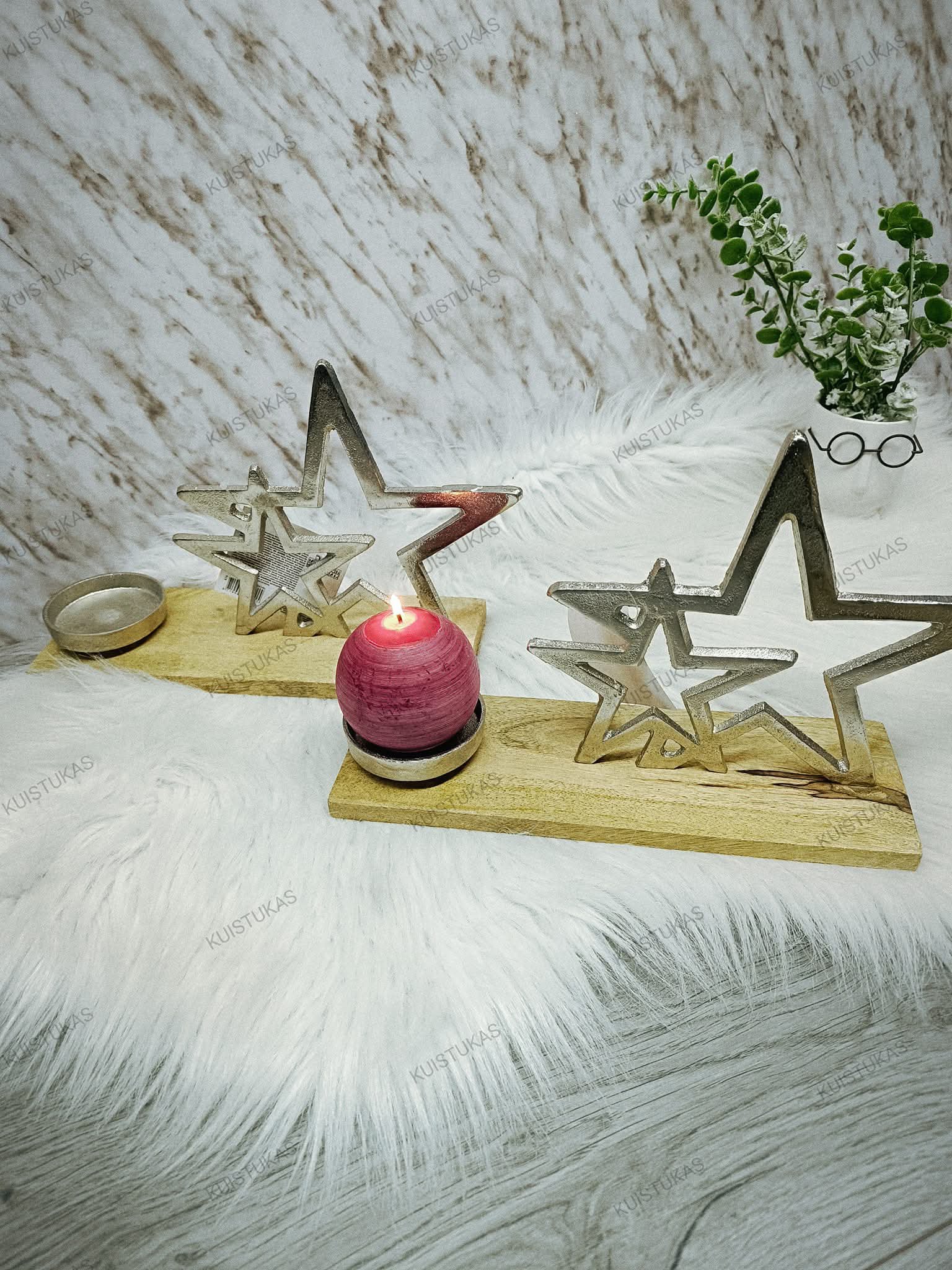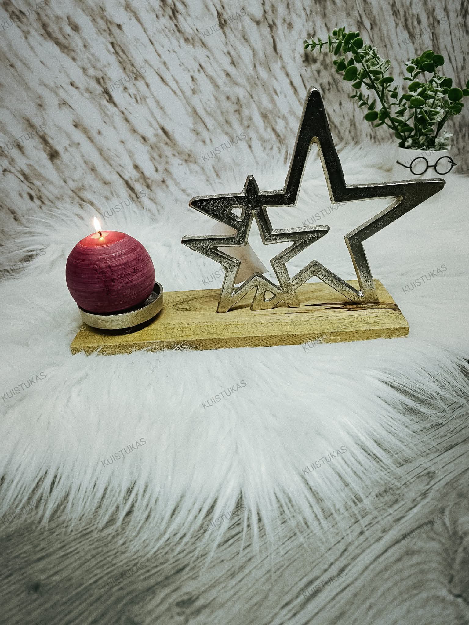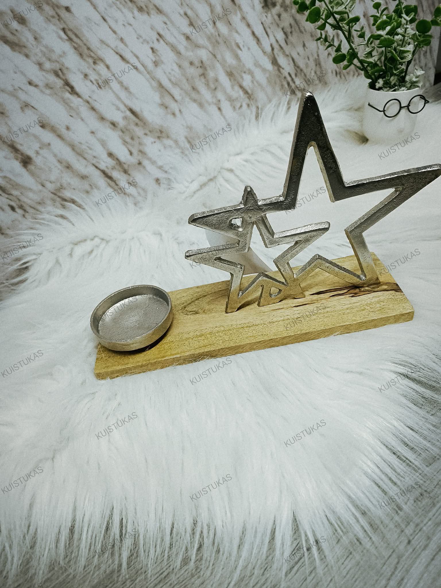 Ši elegantiška žvakidė derina natūralaus medžio pagrindą su blizgiomis metalinėmis žvaigždėmis, simbolizuojančiomis šventinę nuotaiką, ramybę ir šviesos spindesį.